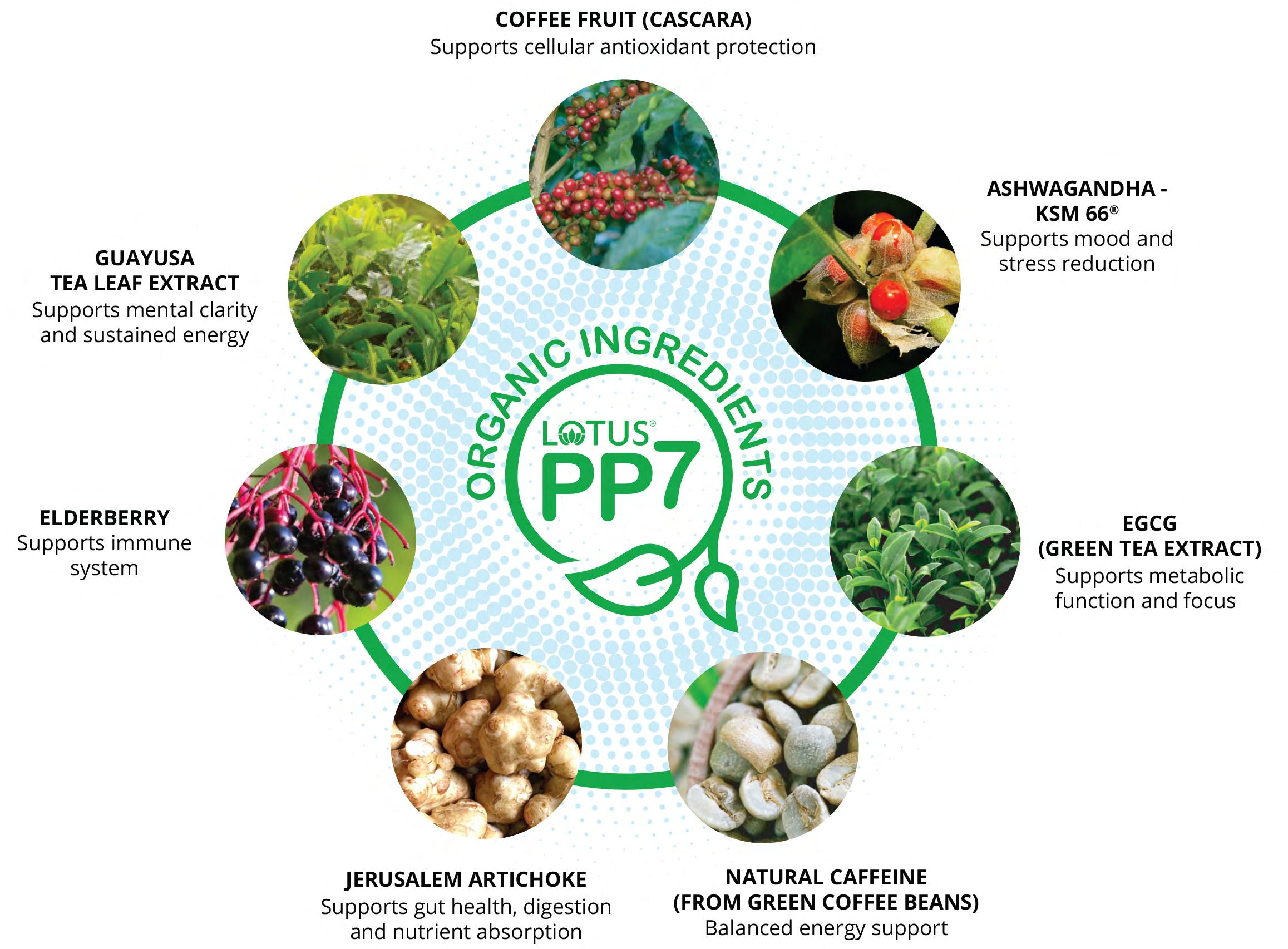 At the core of Lotus Plant Power® is PP7, Plant Power Seven. This is not a collection of trending ingredients assembled for label appeal. It is a deliberately designed plant-based energy system built to support the body as a whole.