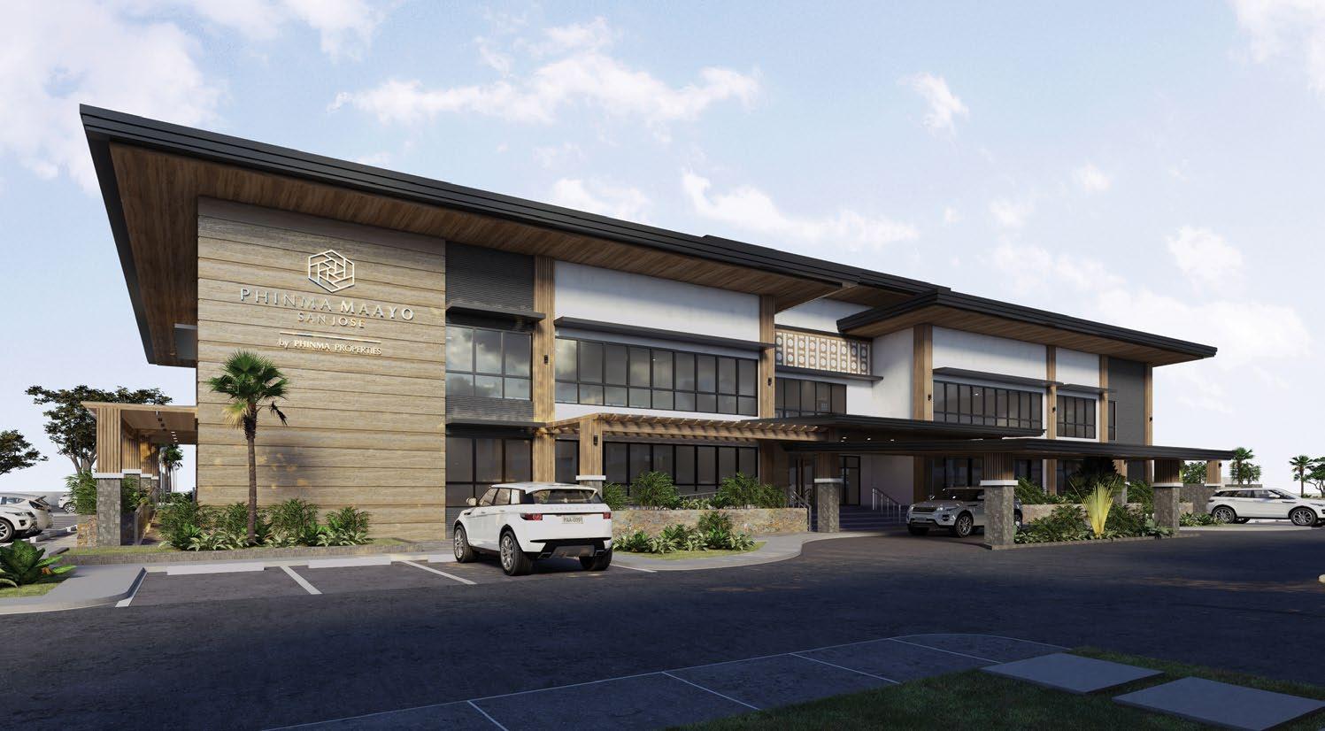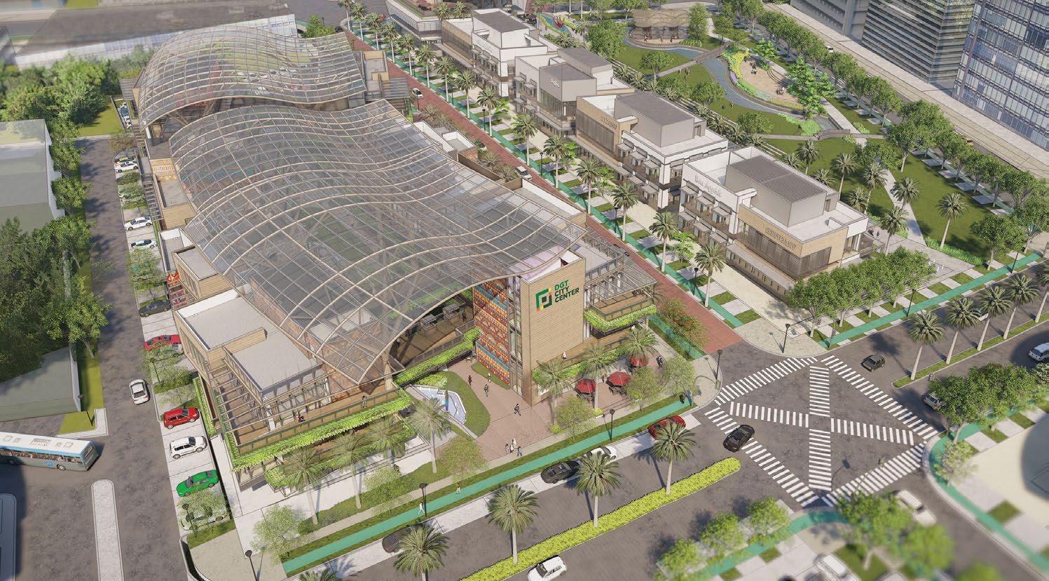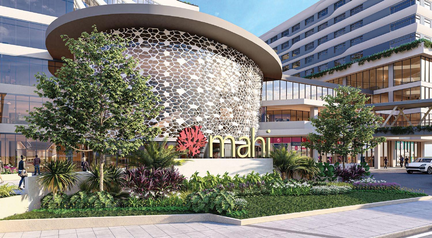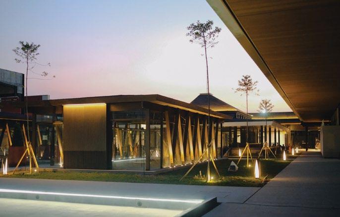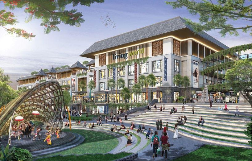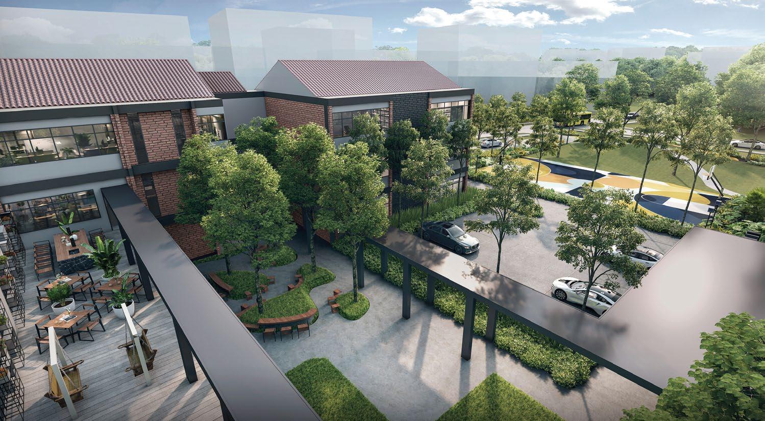 This community mall has a leafy garden at its heart, with brown interiors and sunlit walkways adding natural ambiance to a site with eyecatching storefronts.