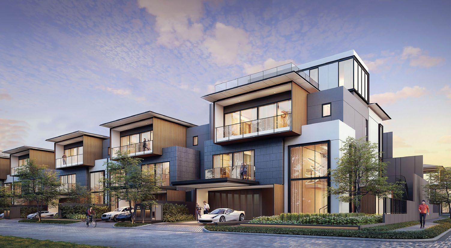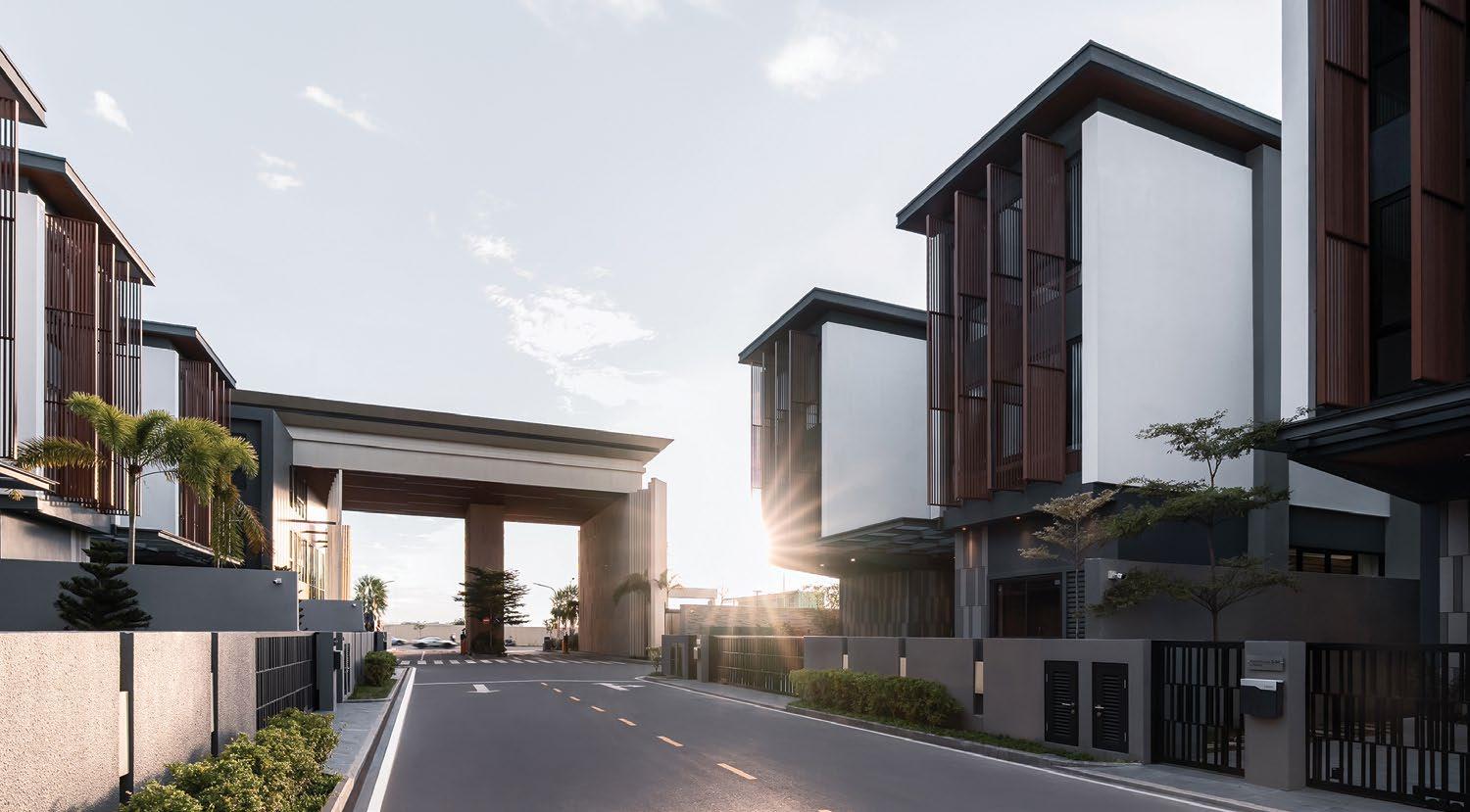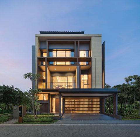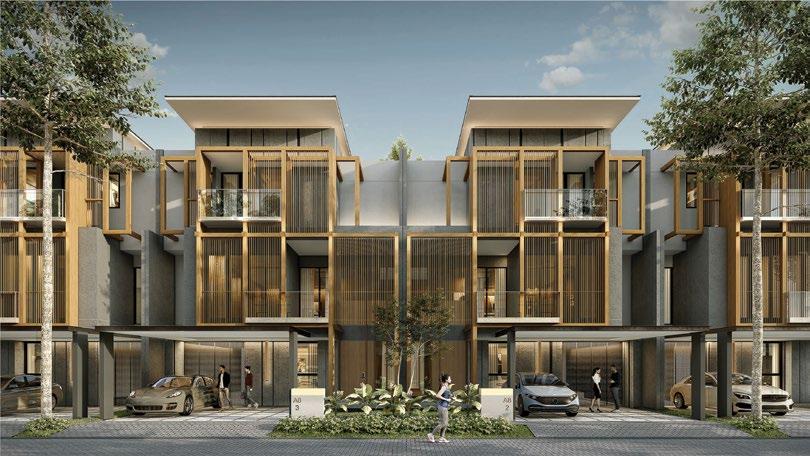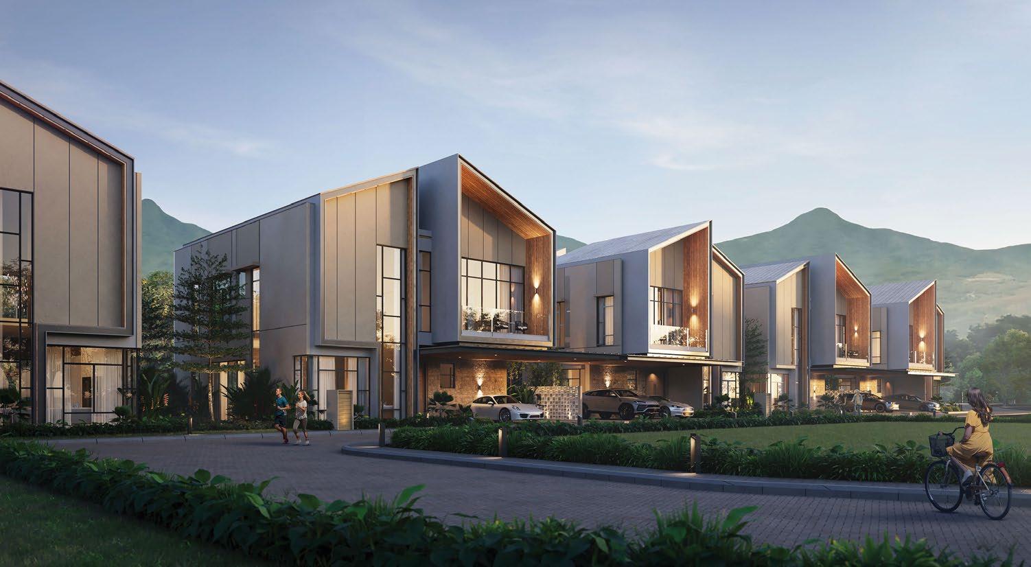The interiors, lit through large windows, are distinct with brown and white décor that connect various areas of the villas, shophouses, and home offices.