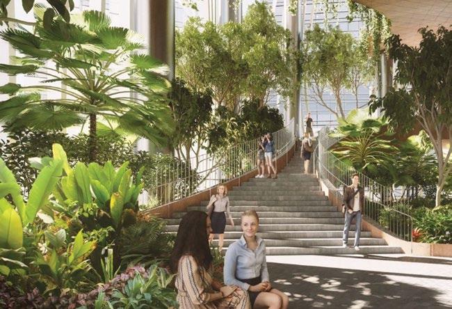 The building is broken into less bulky sections, connecting workers with airy communal spaces and vertical greenery, while open staircases link interiors.