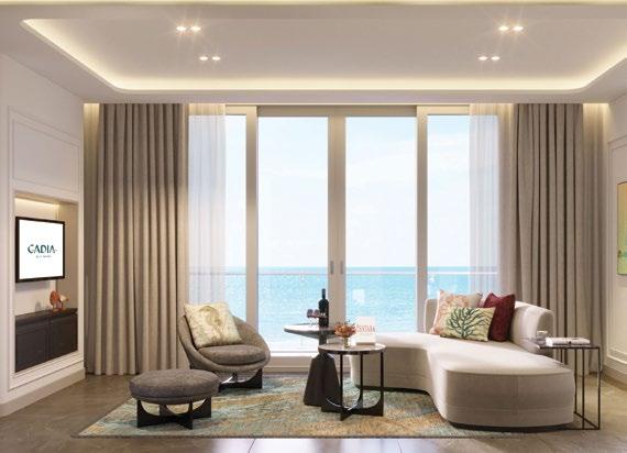 All three-bedroom kitchens come with full Miele appliances including a wine chiller, coffee maker, and steam oven, in addition to a Gaggenau double door fridge. The kitchen countertop adds a welcoming ambience to the dining and foyer area.