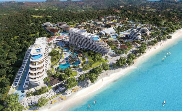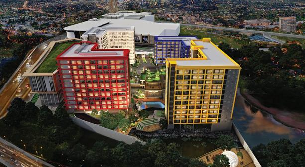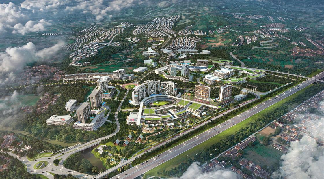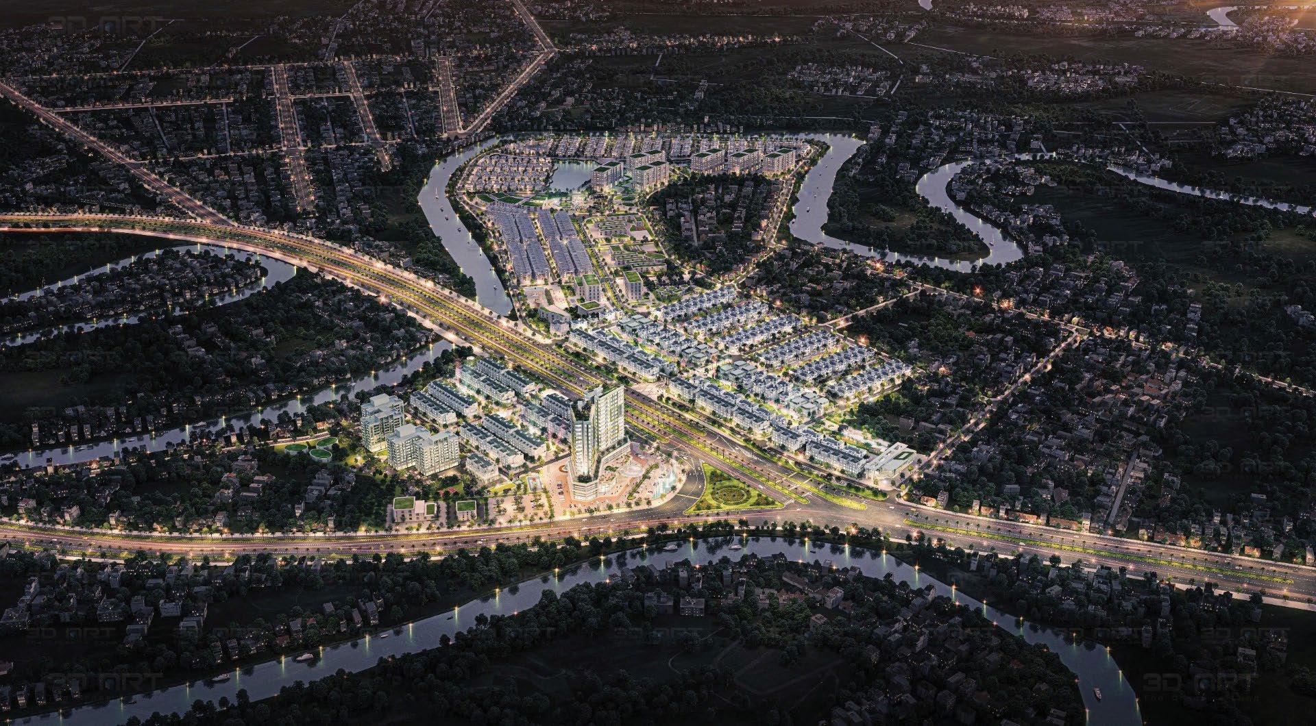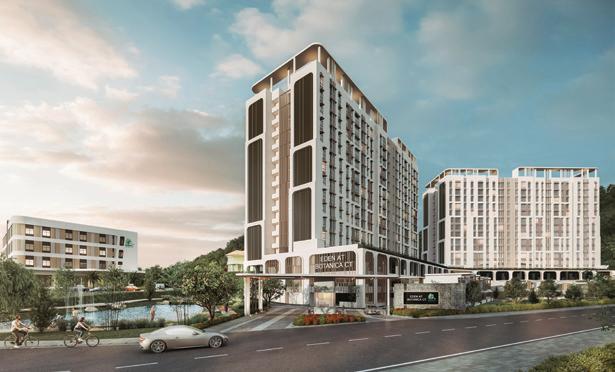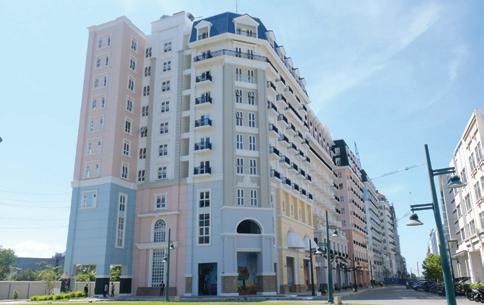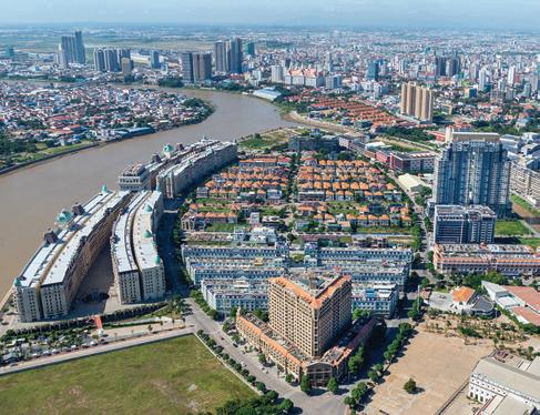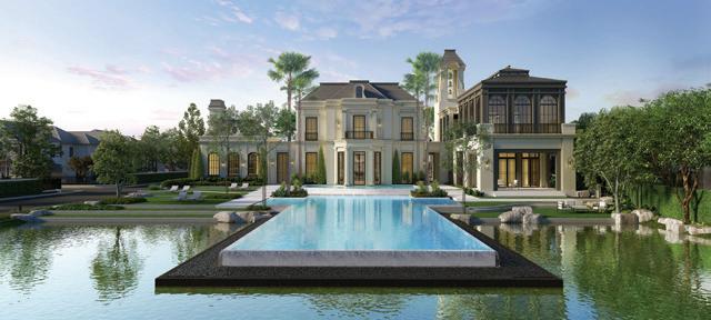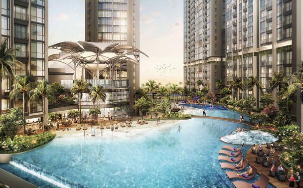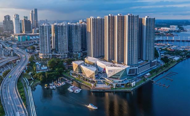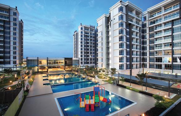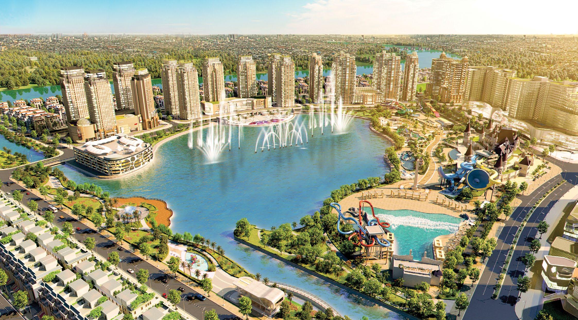 The riverside township holds a themed water park, canal, and musical fountain square, along with apartments, shophouses, townhouses, and villas.