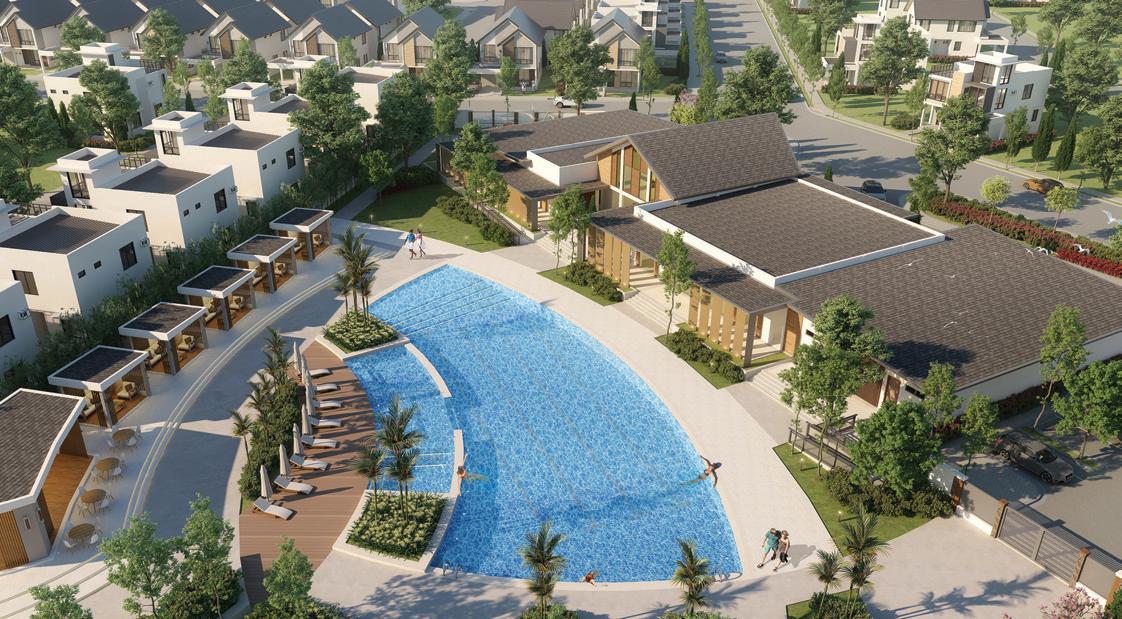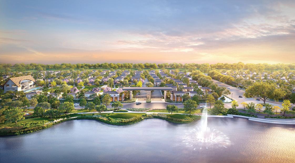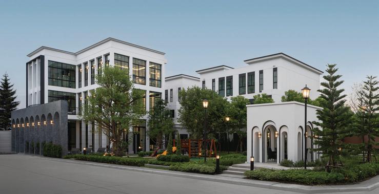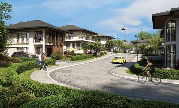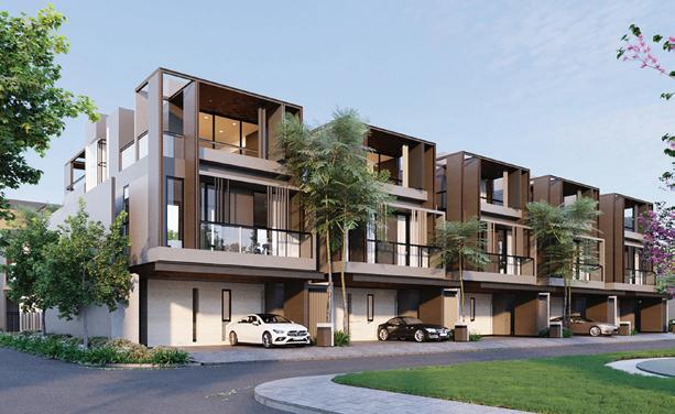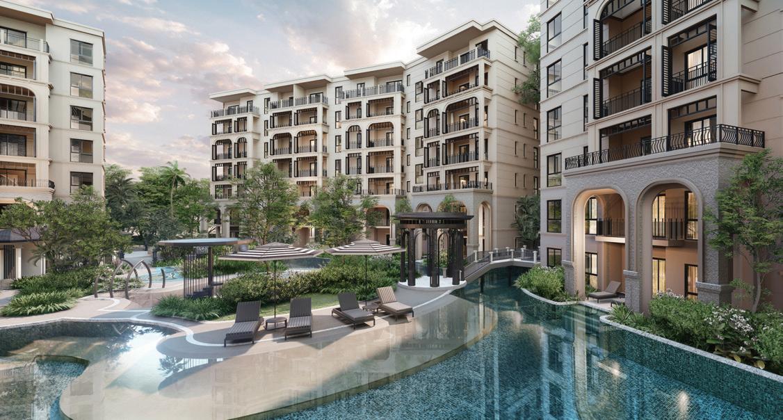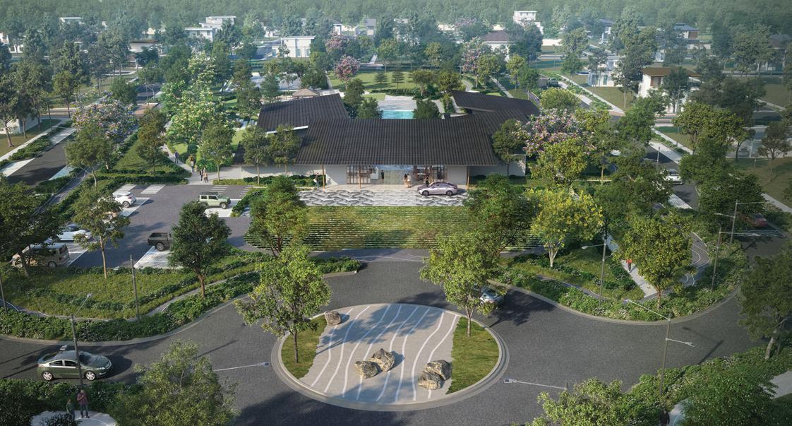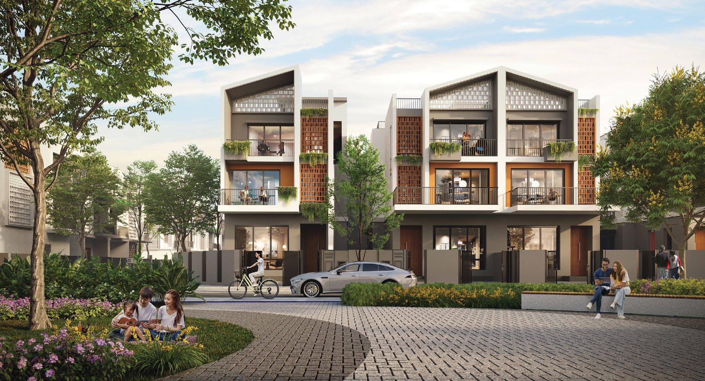Integrating European-influenced townhouses and a commercial district, the site adheres to biophilic design with walkways, a plaza, alfresco dining, and tree-lined avenues.