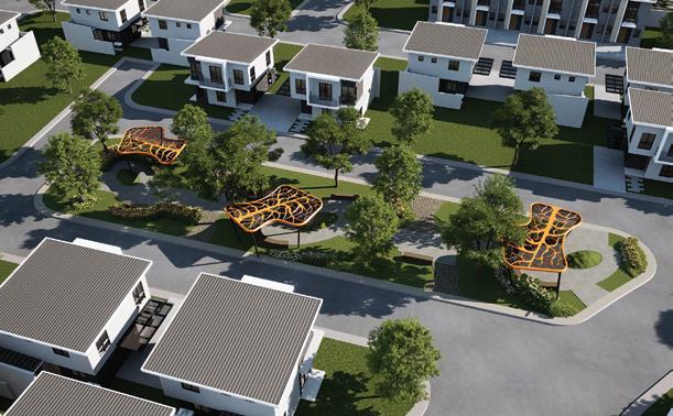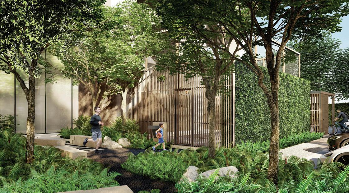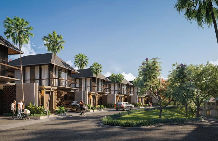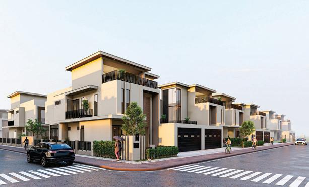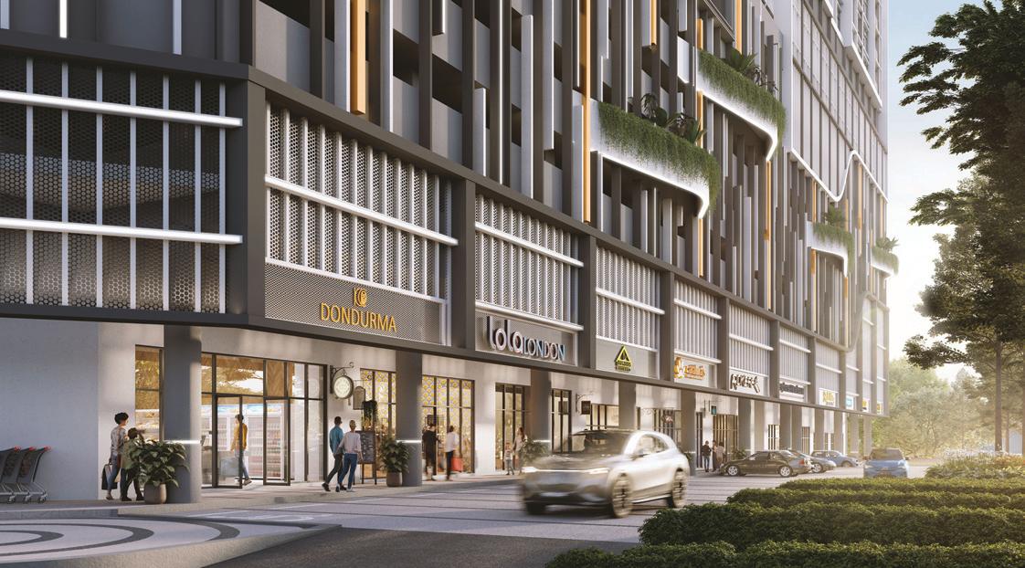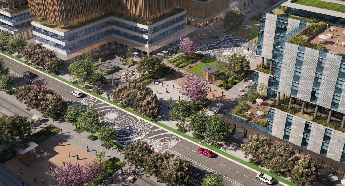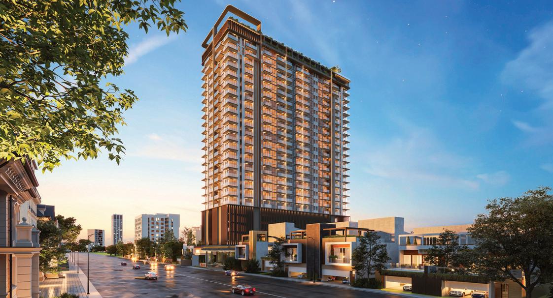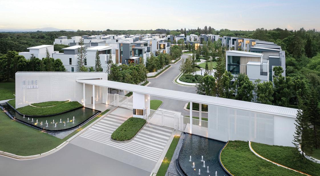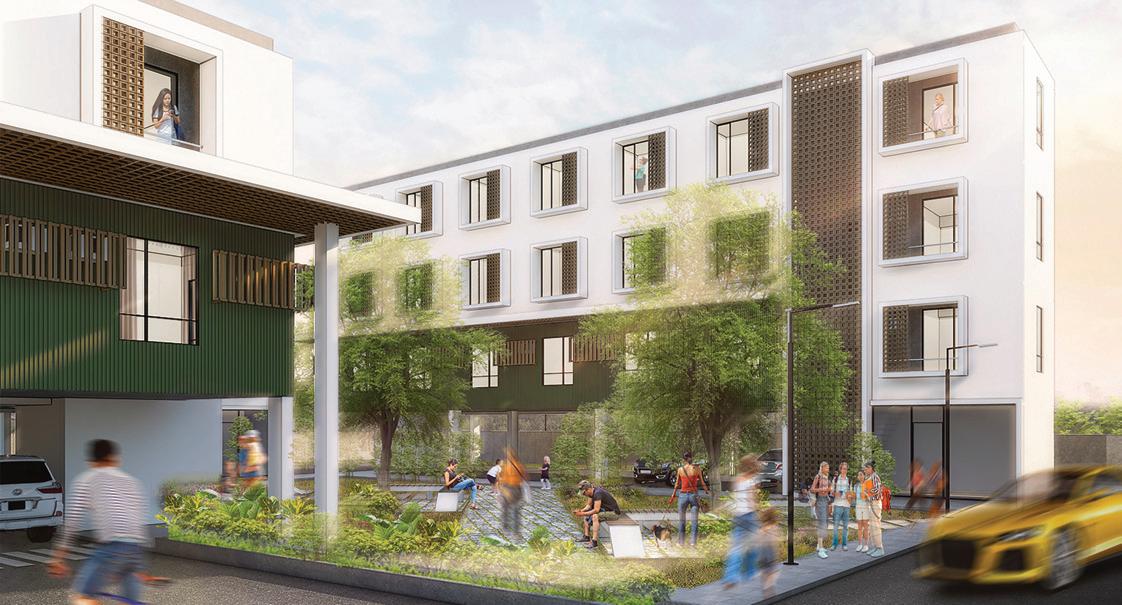 Integrating European-influenced townhouses and a commercial district, the site adheres to biophilic design with walkways, a plaza, alfresco dining, and tree-lined avenues.