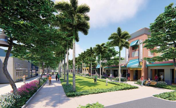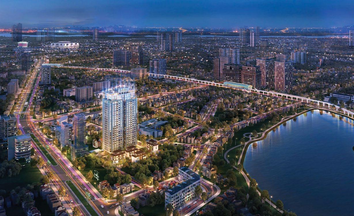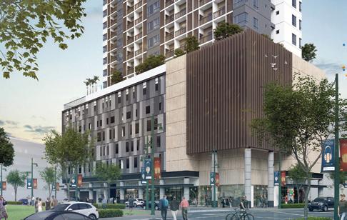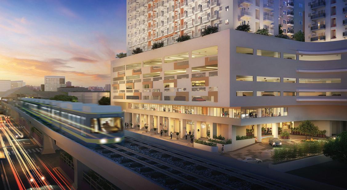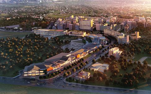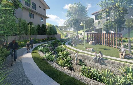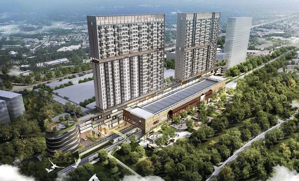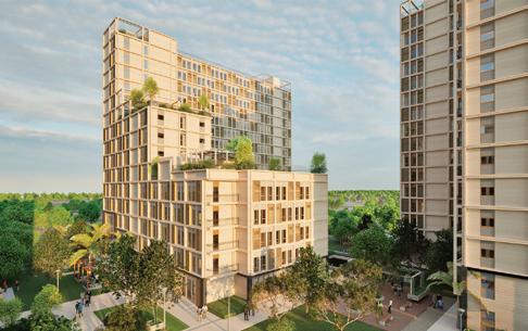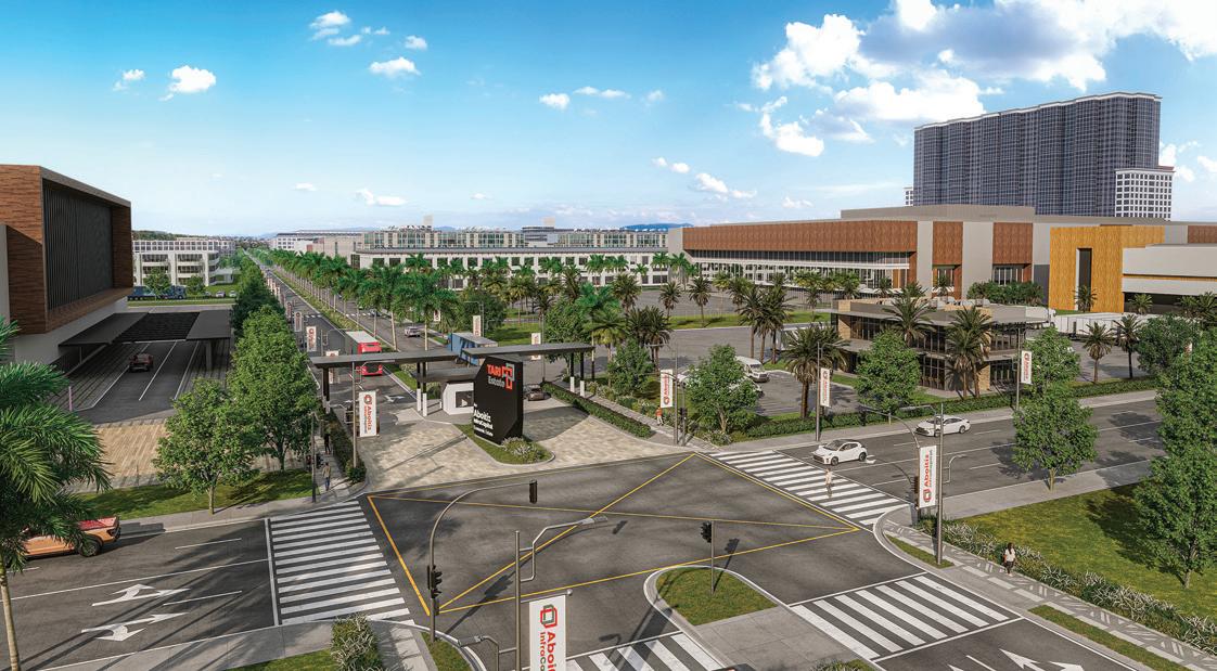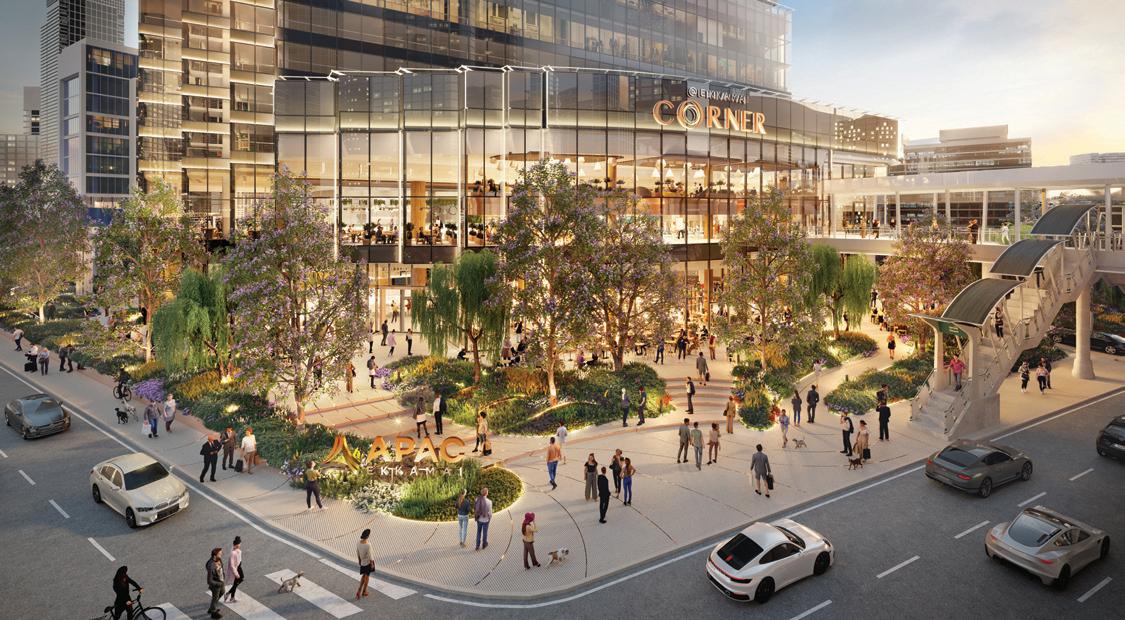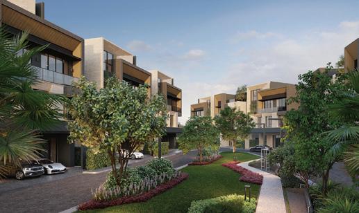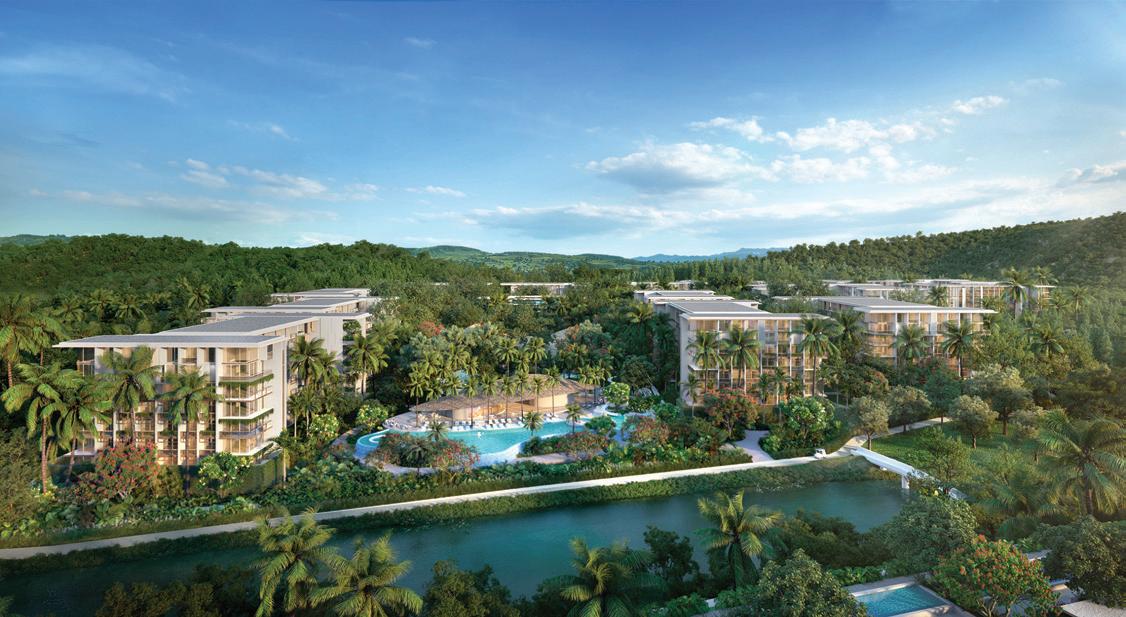 Integrating European-influenced townhouses and a commercial district, the site adheres to biophilic design with walkways, a plaza, alfresco dining, and tree-lined avenues.