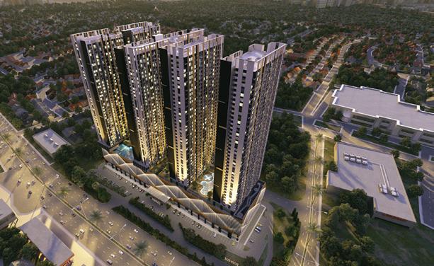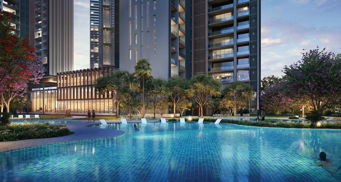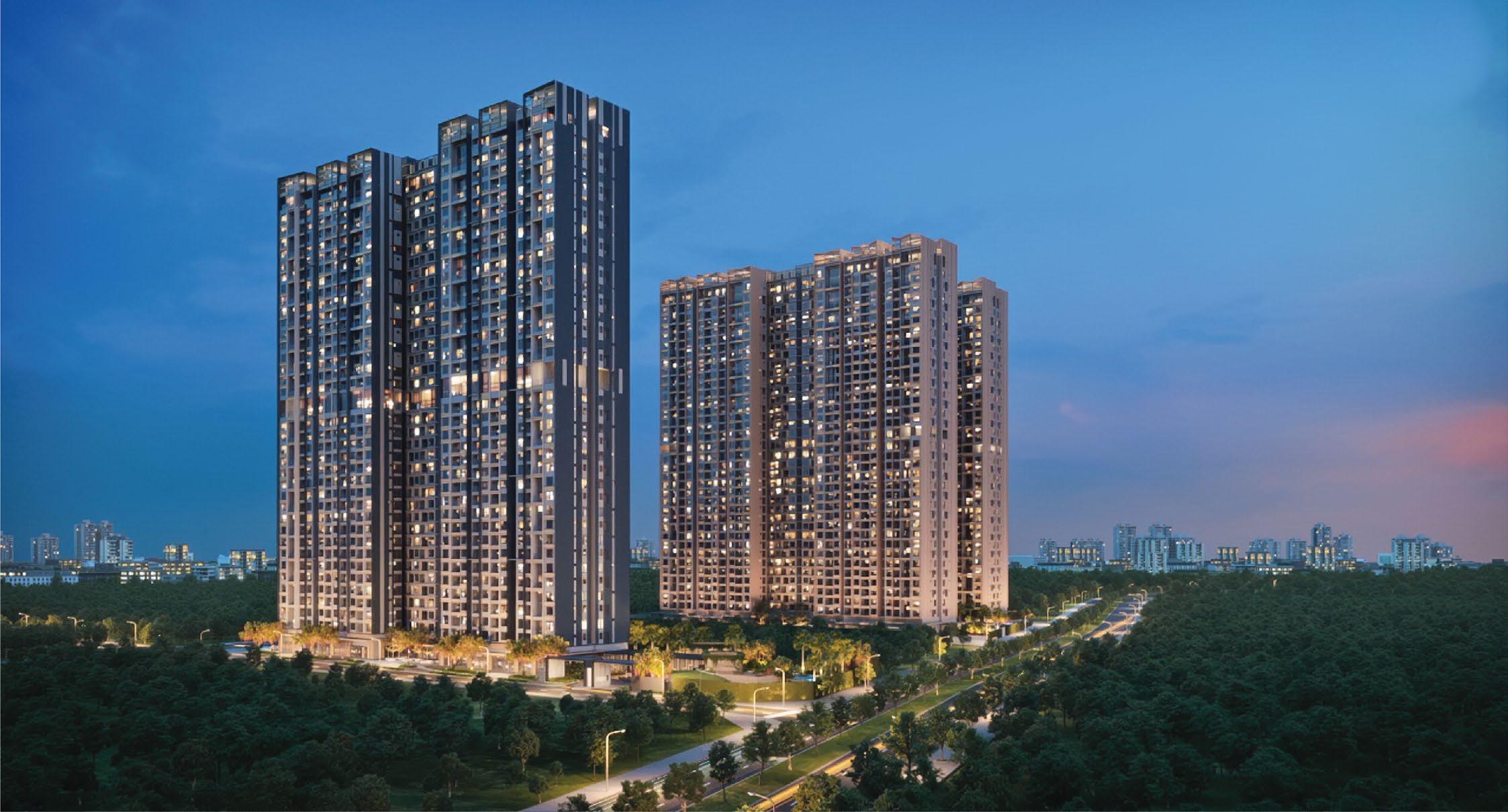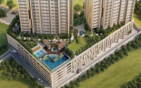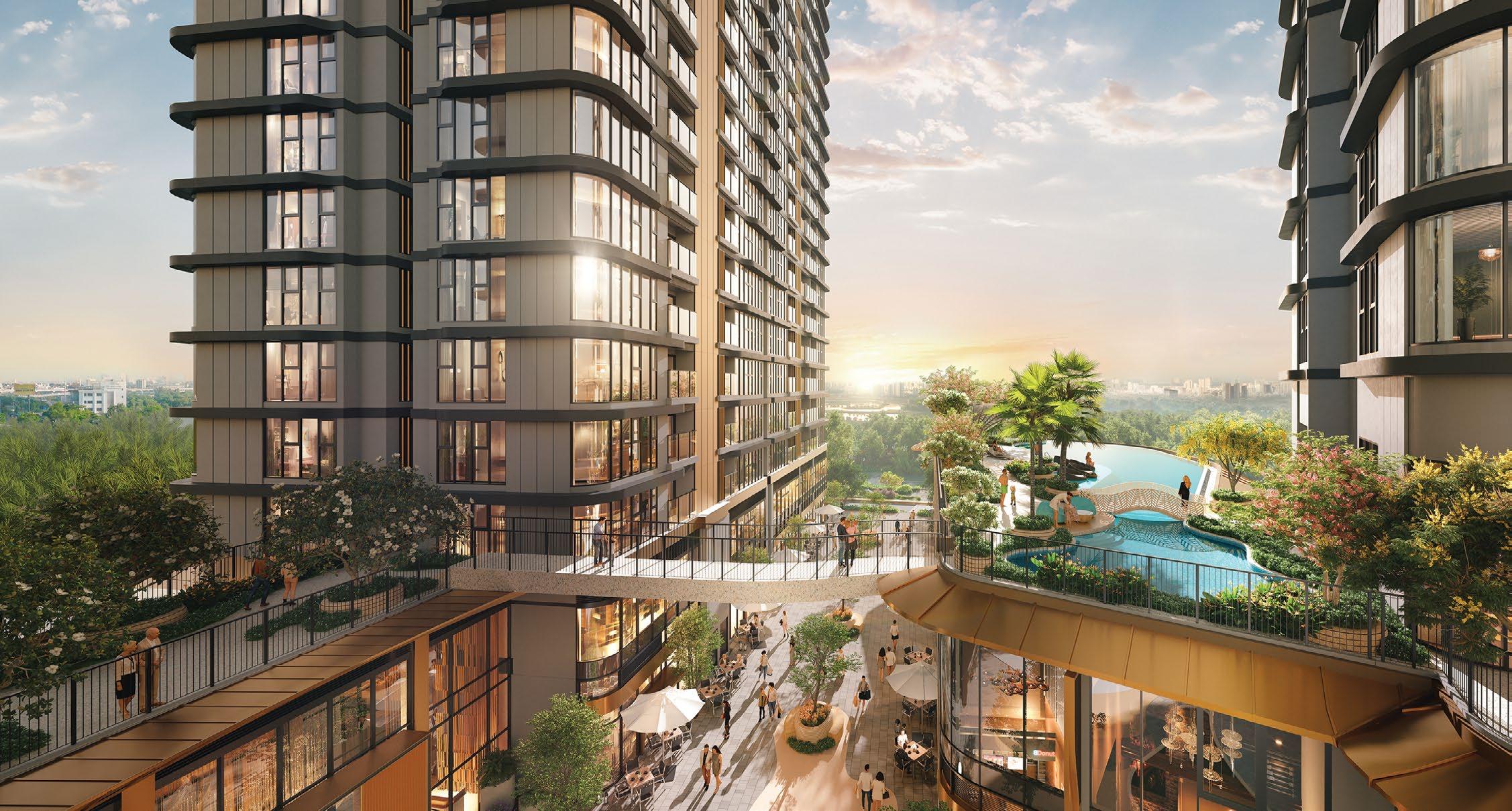 A promenade skywalk links these residential towers, featuring amenities like lagoon-style pools, yoga areas, pocket gardens, and jogging tracks.