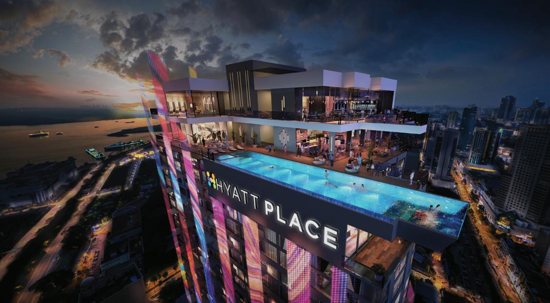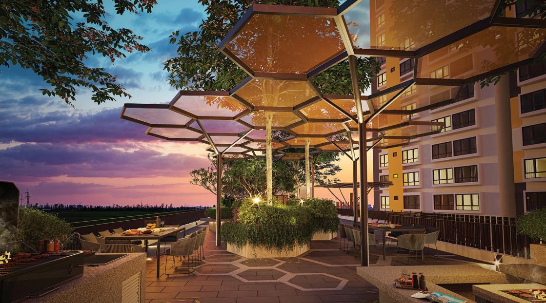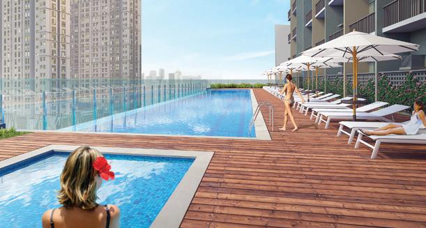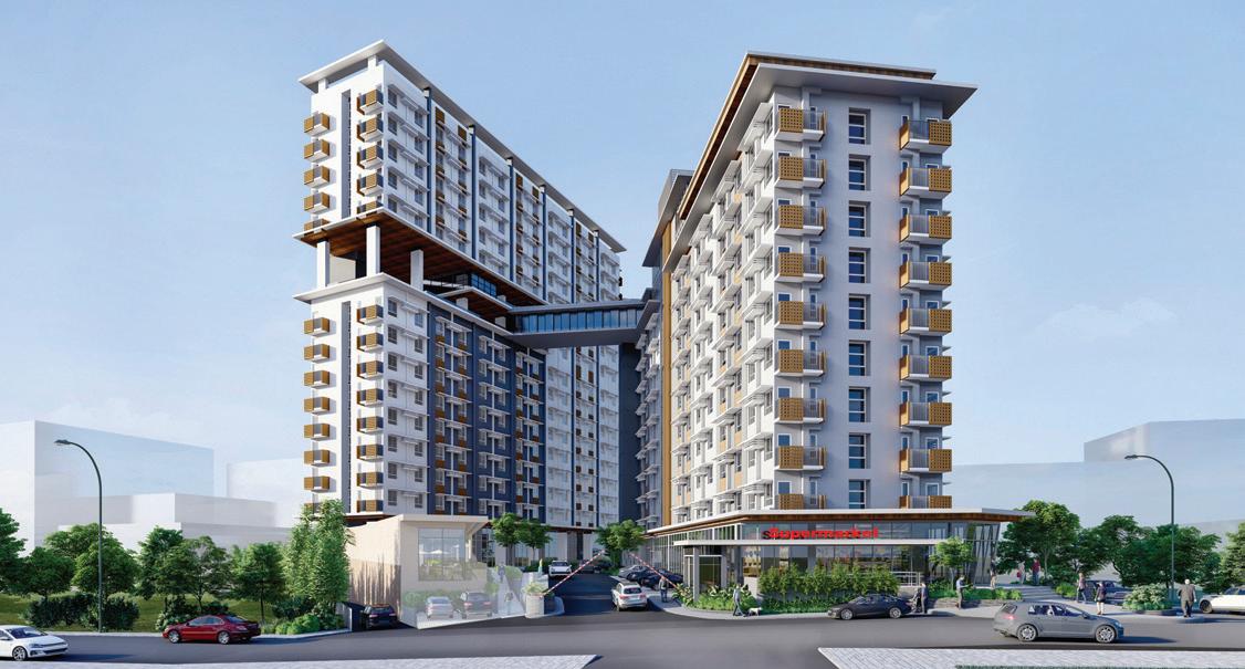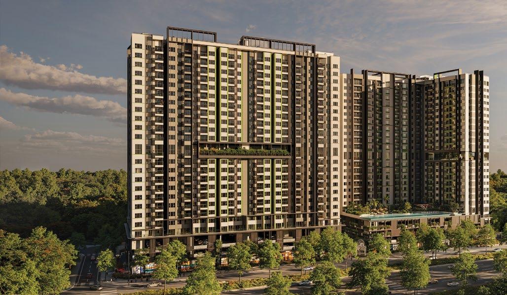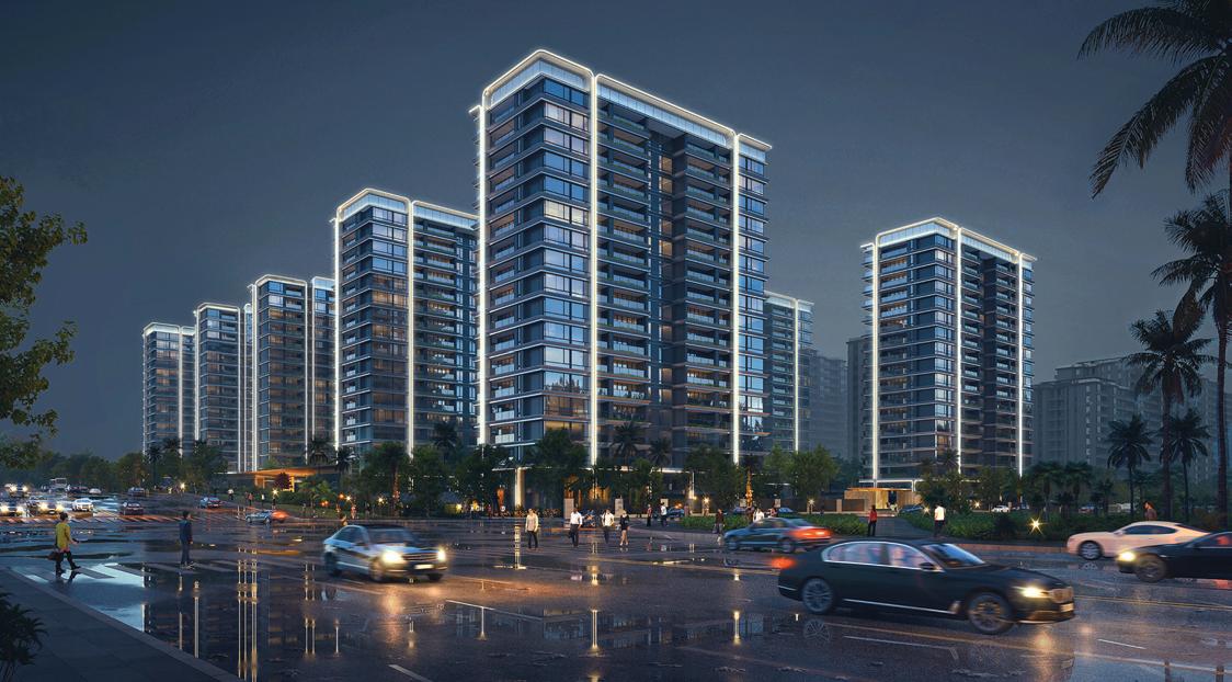 A promenade skywalk links these residential towers, featuring amenities like lagoon-style pools, yoga areas, pocket gardens, and jogging tracks.