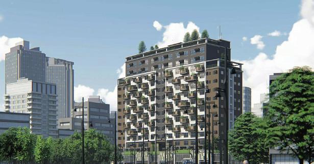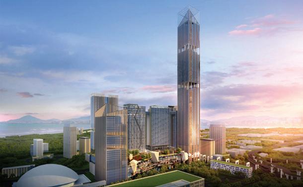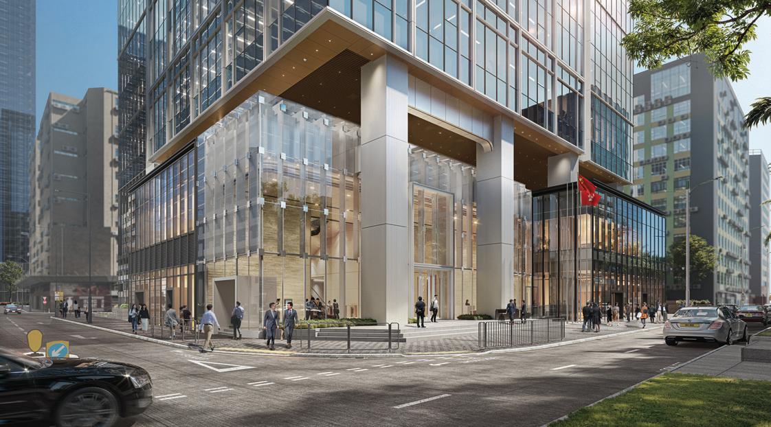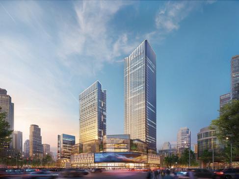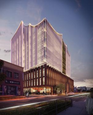 The project encompasses offices, a luxury hotel, retail podium, and green elements, including a grassy façade, elevated garden, and sunken amphitheatre.