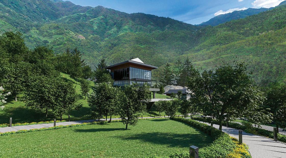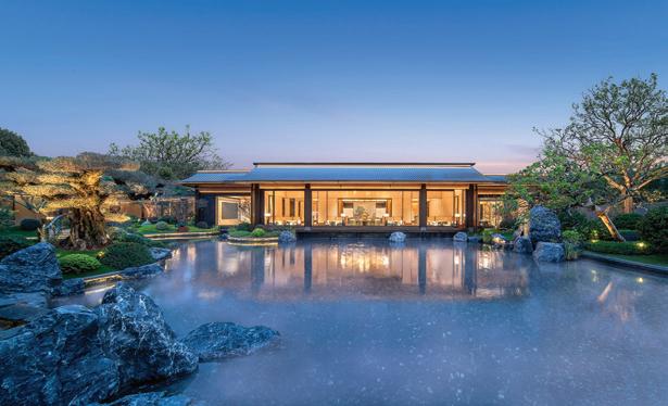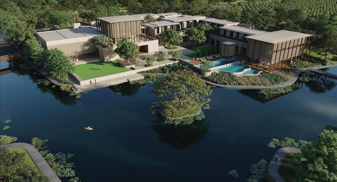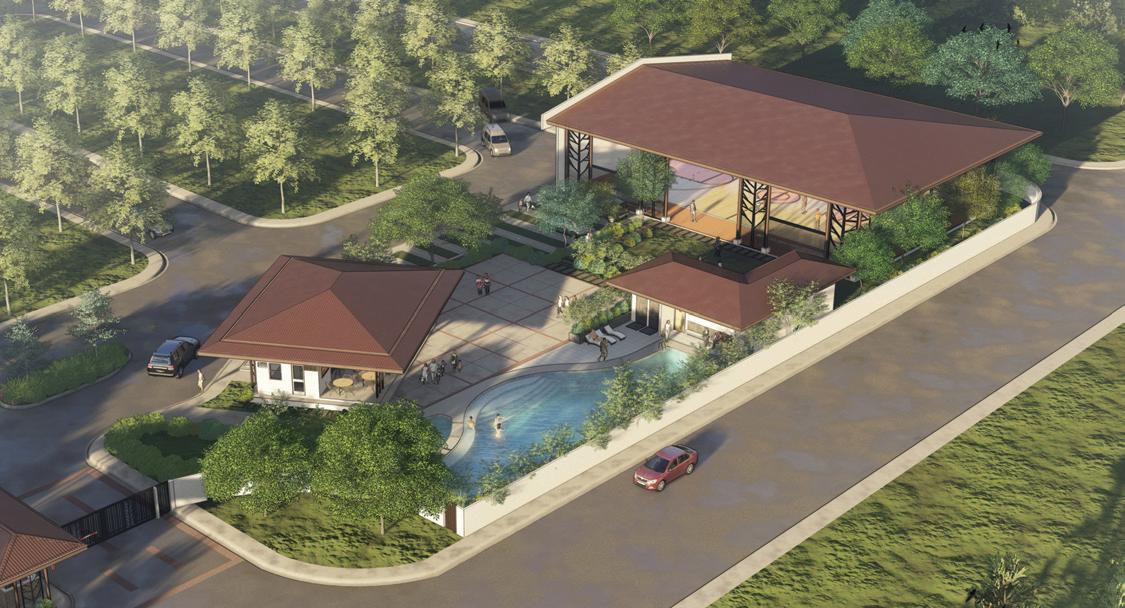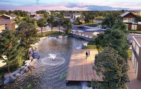 The township embraces forest-scapes with wellness amenities, complemented by riverside walks, a waterfront resort area, stepping-stone pathways, gardens, parks, and an onsen.
