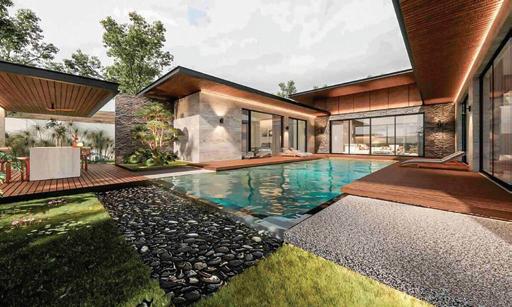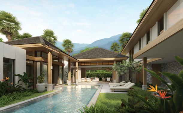 These villas feature Indochinese design with pitched roofs, natural wood interiors, stone walls, outdoor terraces, tiered greenery, and cobbled streets.