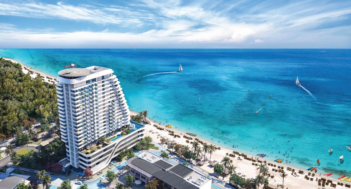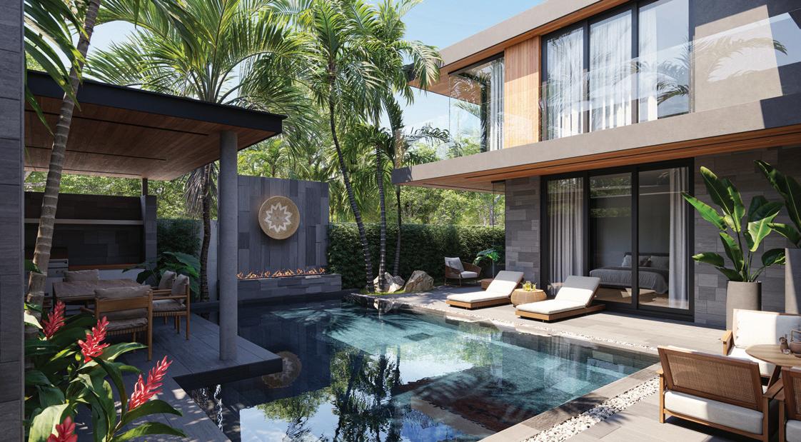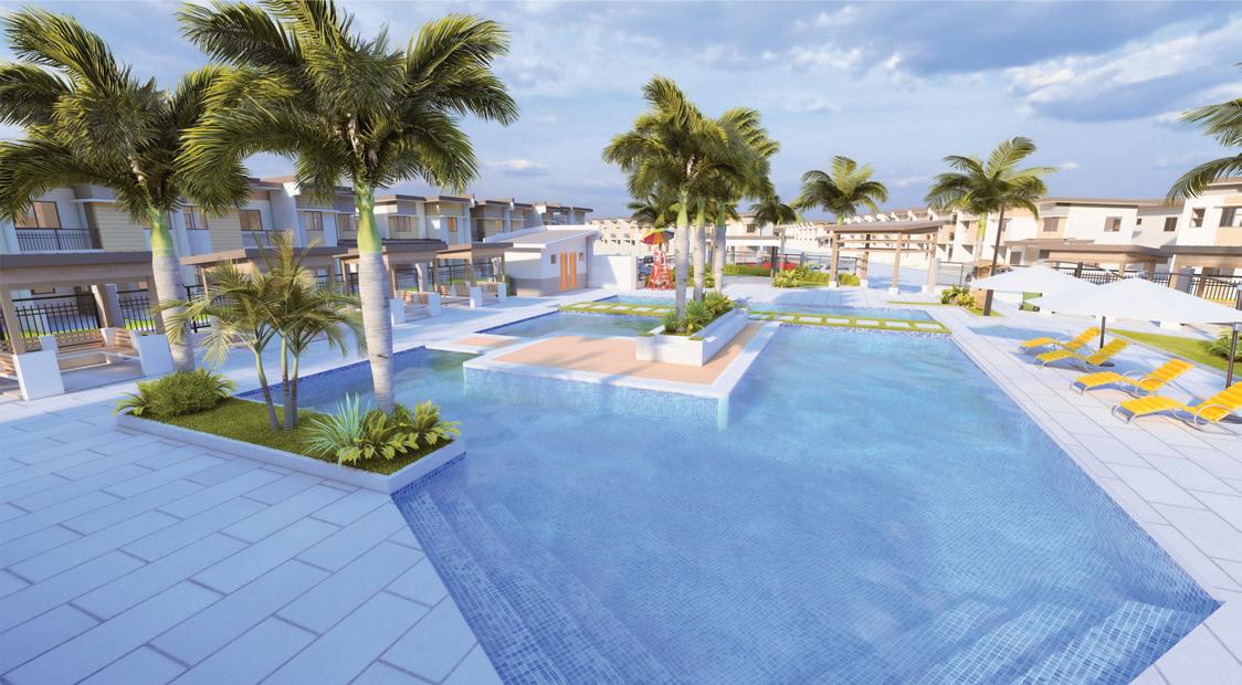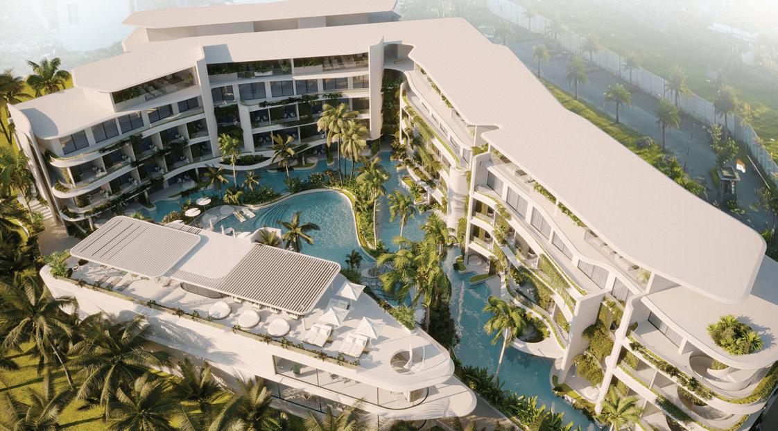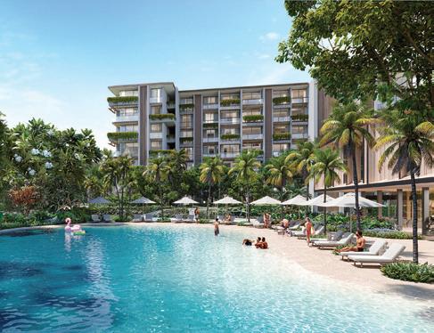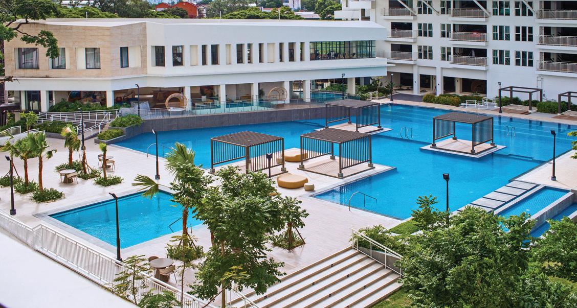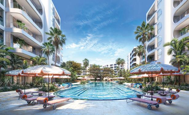 The project boasts a variety of pools as well as a resort-style lagoon, plus a gourmet kitchen, co-working spaces, and sky amenities.
