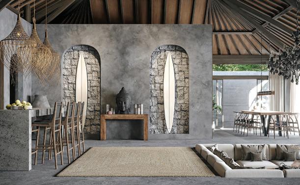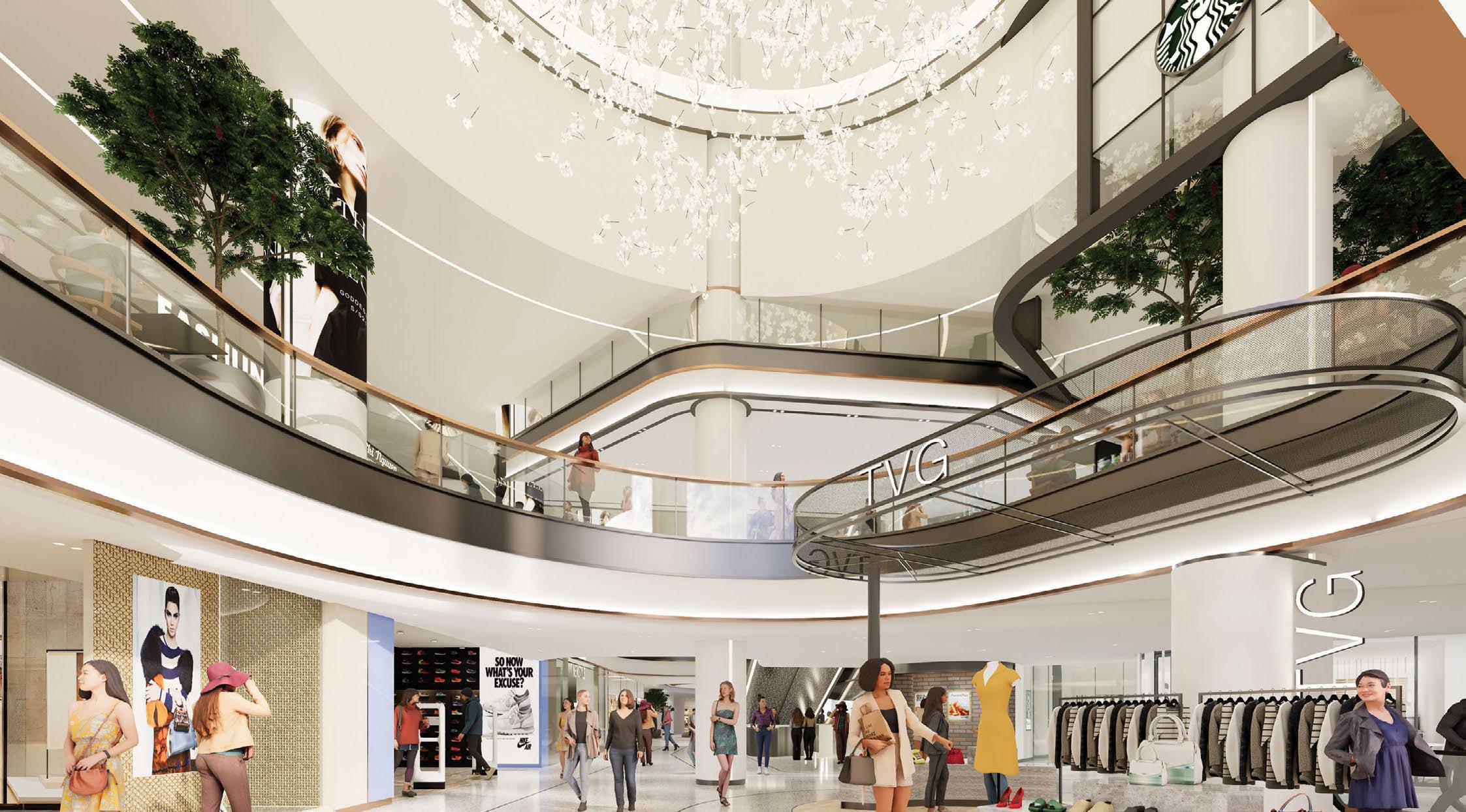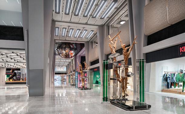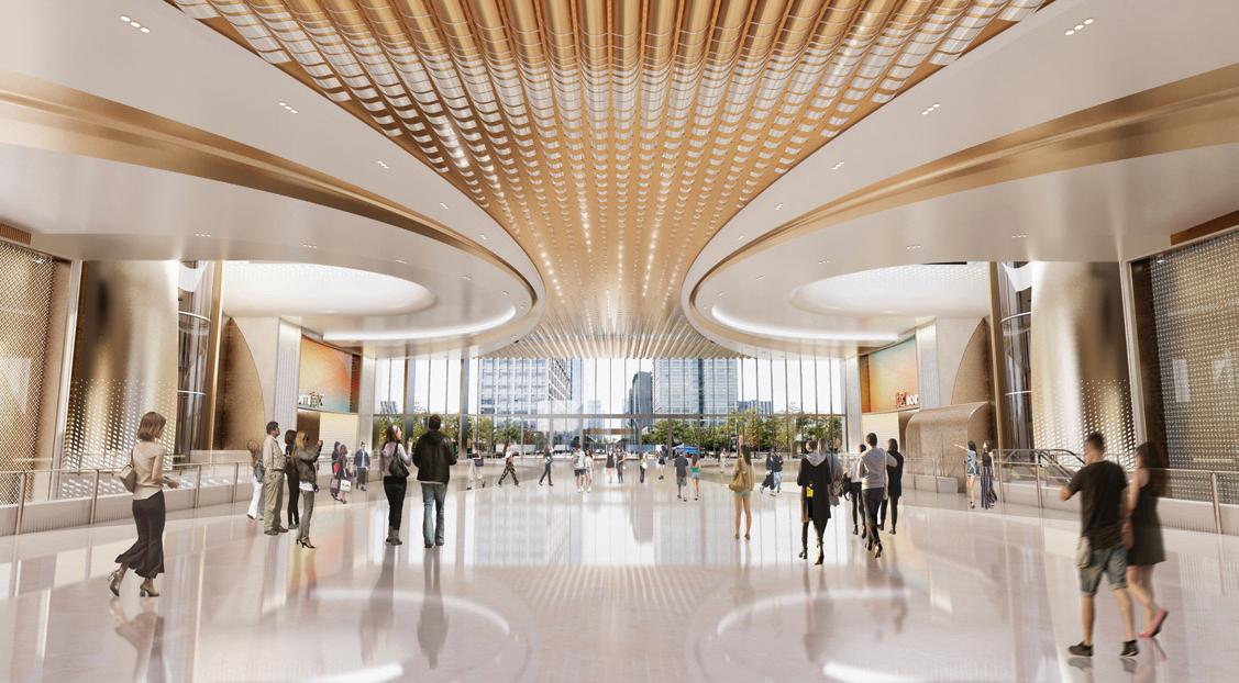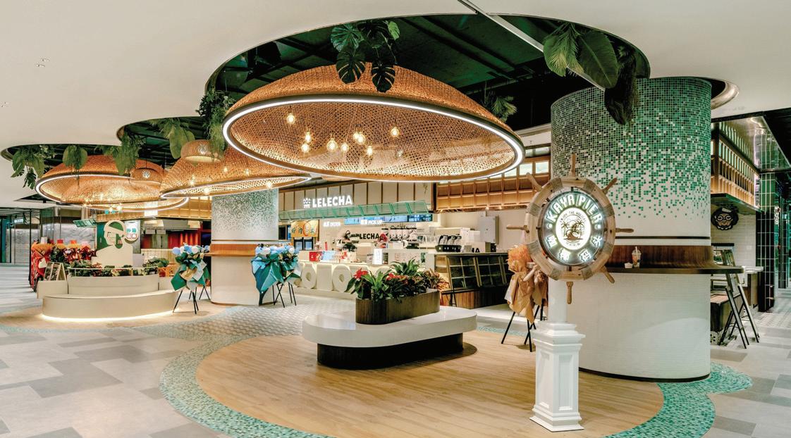 The interiors blend seamlessly with commercial spaces, using wavy lines for walkways, defined F&B areas, smooth retail surfaces, and earthy basement tones.
