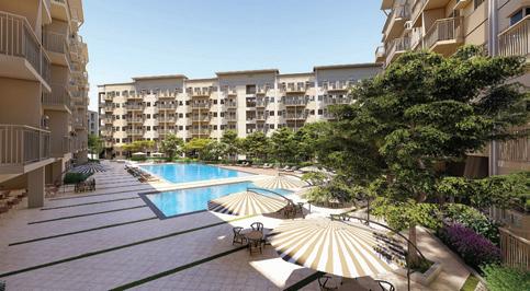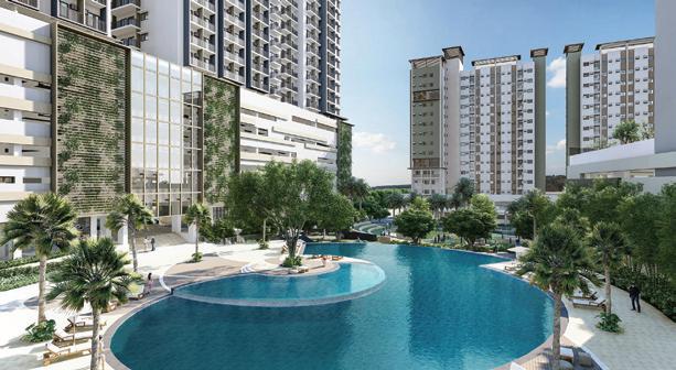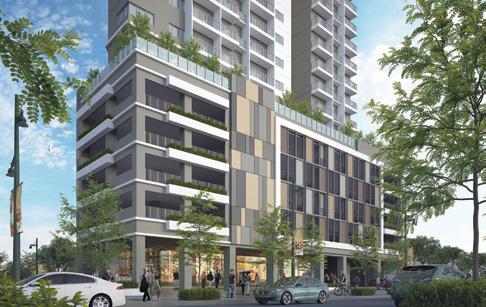 Lifestyle features and a commercial plaza define this project with pools, gardens, and a green trail, plus fitness amenities and an alfresco cinema.