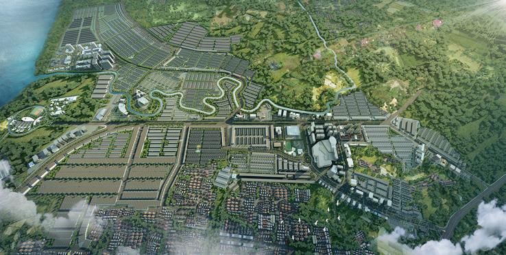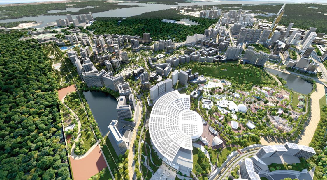 This eco-smart site features water, wastewater, and waste management plants, a power substation, distribution grid, and centralised heating system.