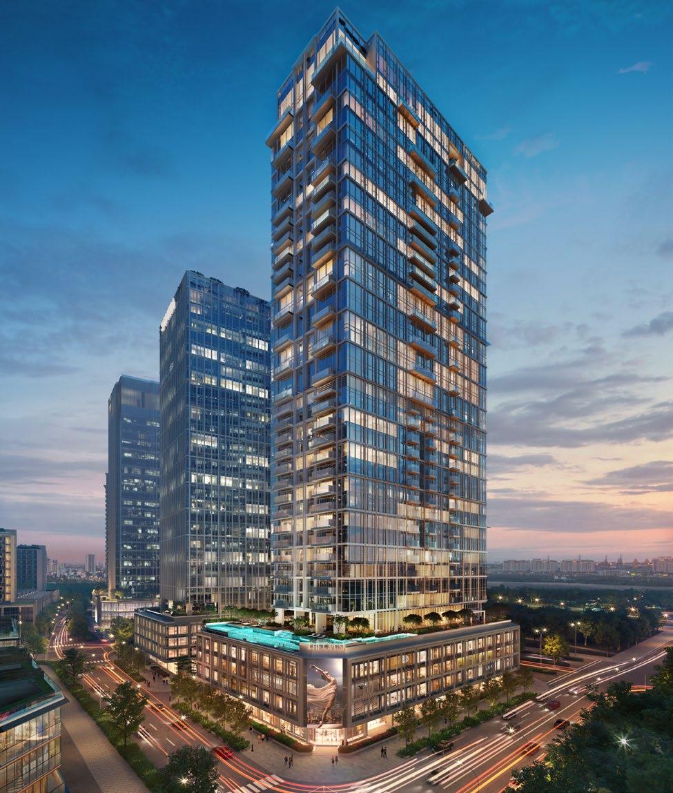 Layouts are column-free, effectively offering “lots in the sky” for owners to shape as they please, with no more than four units per floor. Arrival is deliberately discreet, with a tree-lined driveway shielding the drop-off, while interiors lean on bronze, marble, and stone for restrained luxury. Amenities are curated—a wine lounge, golf simulator, and suspended sky garden— and sustainability targets LEED Gold through façade performance, EV-ready parking, and rainwater recycling.