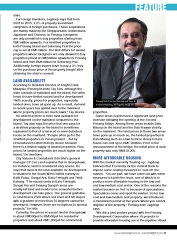 FEATURE state. For foreign investors, Jagdeep says that from 2001 to 2013, 2.2% of property investment comprises of foreign purchases. These acquisitions are mainly made by the Singaporeans, Indonesians, Japanese and Chinese. In Penang, foreigners are only permitted to buy properties starting from RM1million upwards. For stratified properties in both Penang Island and Seberang Prai the price cap is set at RM1million. The limit differs for landed properties where foreigners are only allowed to buy properties priced at RM2million upwards for Penang Island and from RM1million for Seberang Prai. Additionally, foreign buyers have to pay a 3% levy on the purchase price of the property bought after obtaining the state’s consent.