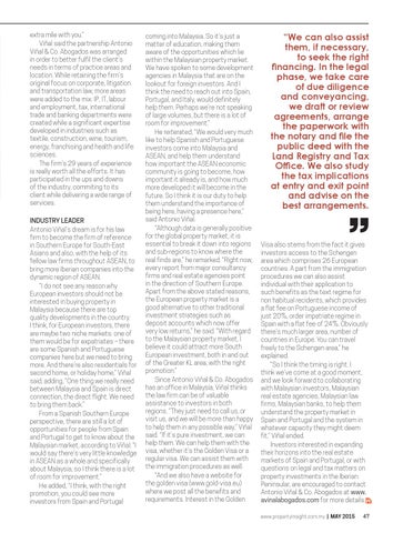 Visa also stems from the fact it gives investors access to the Schengen area which comprises 26 European countries. A part from the immigretion procedures we can also assist individual with their application to such benefits as the text regime for non habitual recidents, which provides a flat fee on Portuguese income of just 20%, order impatriate regime in Spain with a flat fee of 24%. Obviously there’s much larger area, number of countries in Europe. You can travel freely to the Schengen area,” he explained. “So I think the timing is right. I think we’ve come at a good moment, and we look forward to collaborating with Malaysian investors, Malaysian real estate agencies, Malaysian law firms, Malaysian banks, to help them understand the property market in Spain and Portugal and the system in whatever capacity they might deem fit,” Viñal ended. Investors interested in expanding their horizons into the real estate markets of Spain and Portugal, or with questions on legal and tax matters on property investments in the Iberian Peninsular, are encouraged to contact Antonio Viñal & Co. Abogados at www. avinalabogados.com for more details. www.propertyinsight.com.my | MAY 2015
