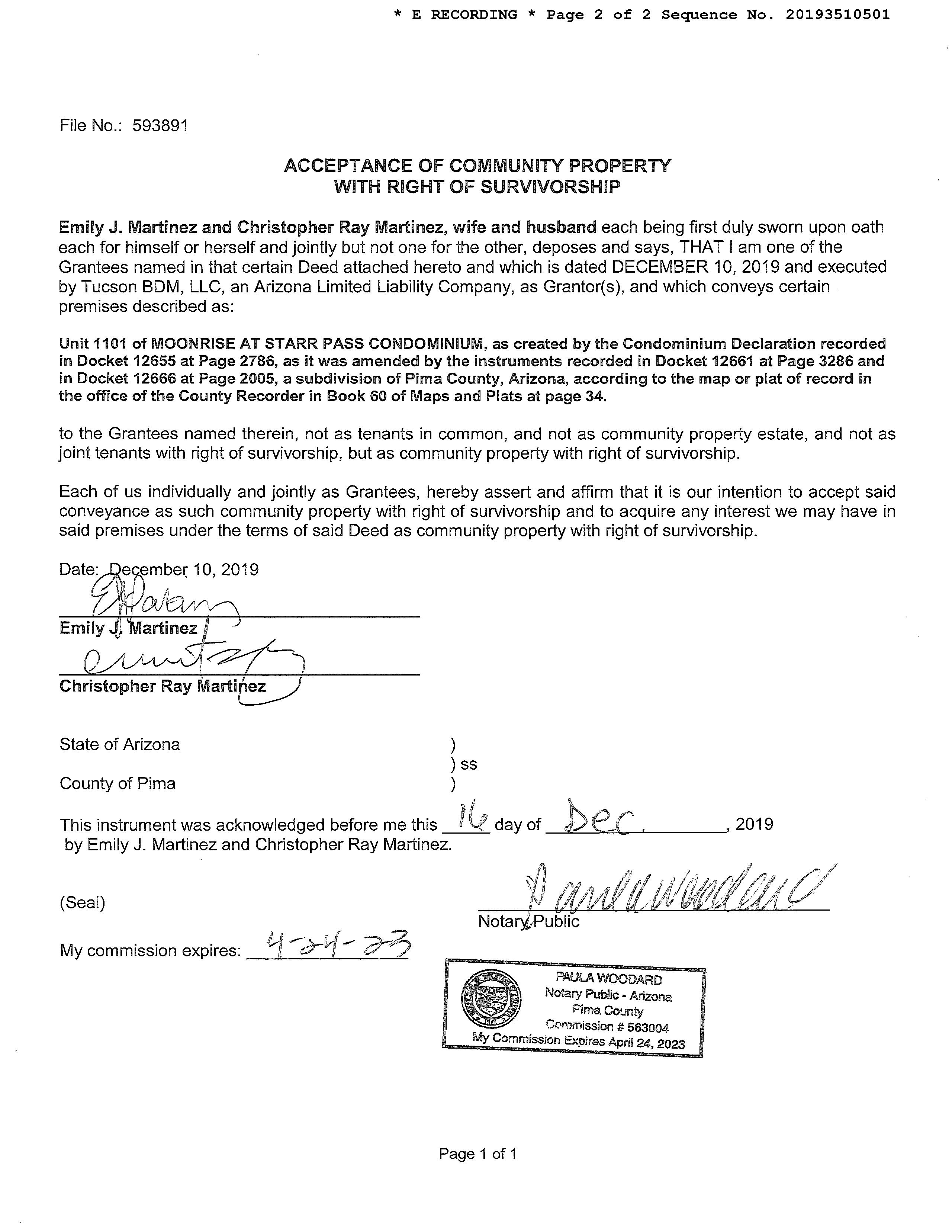 Legal Description : Moonrise At Starr Pass Condominium Unit 1101 Parking 104 & .44642% Int In Ca