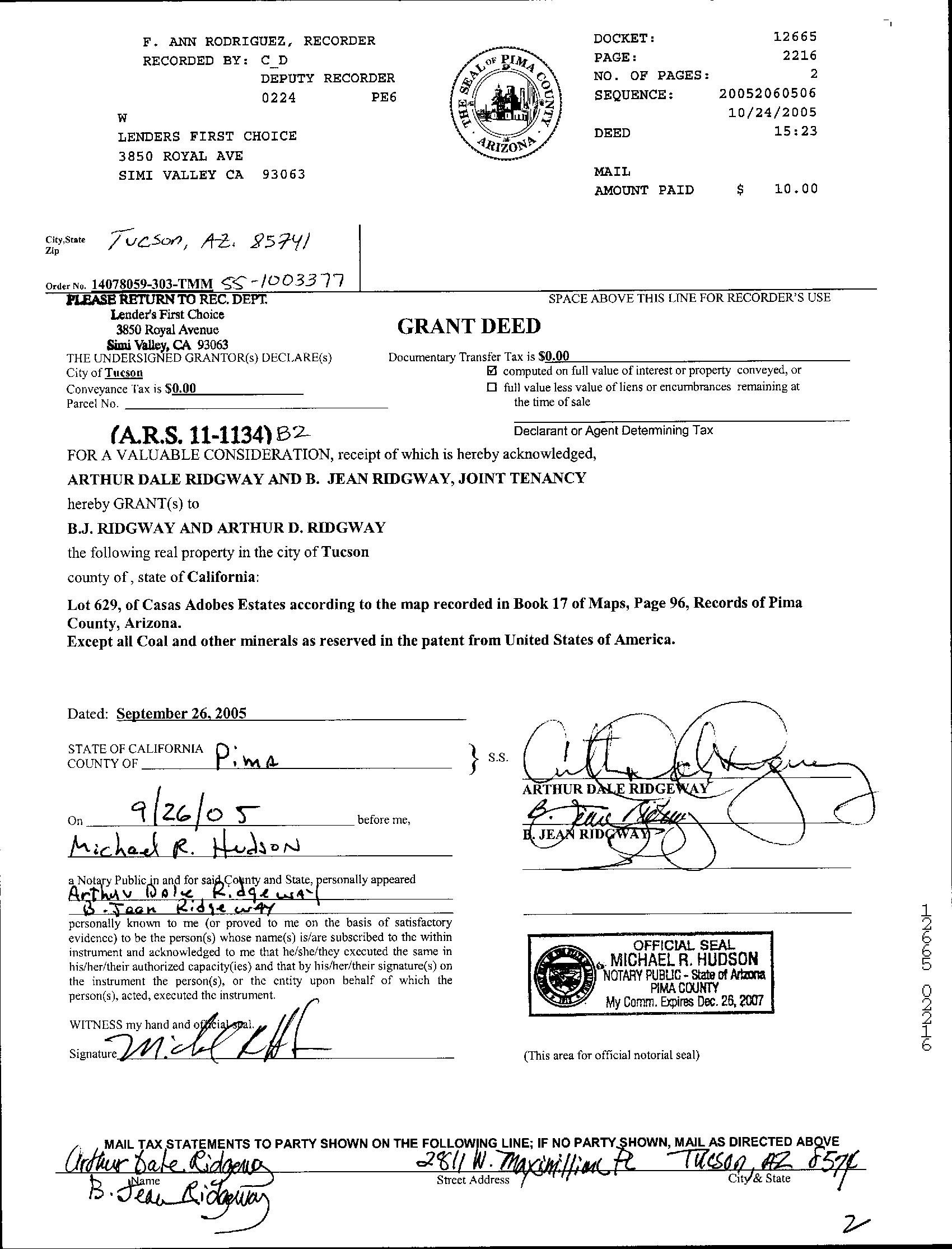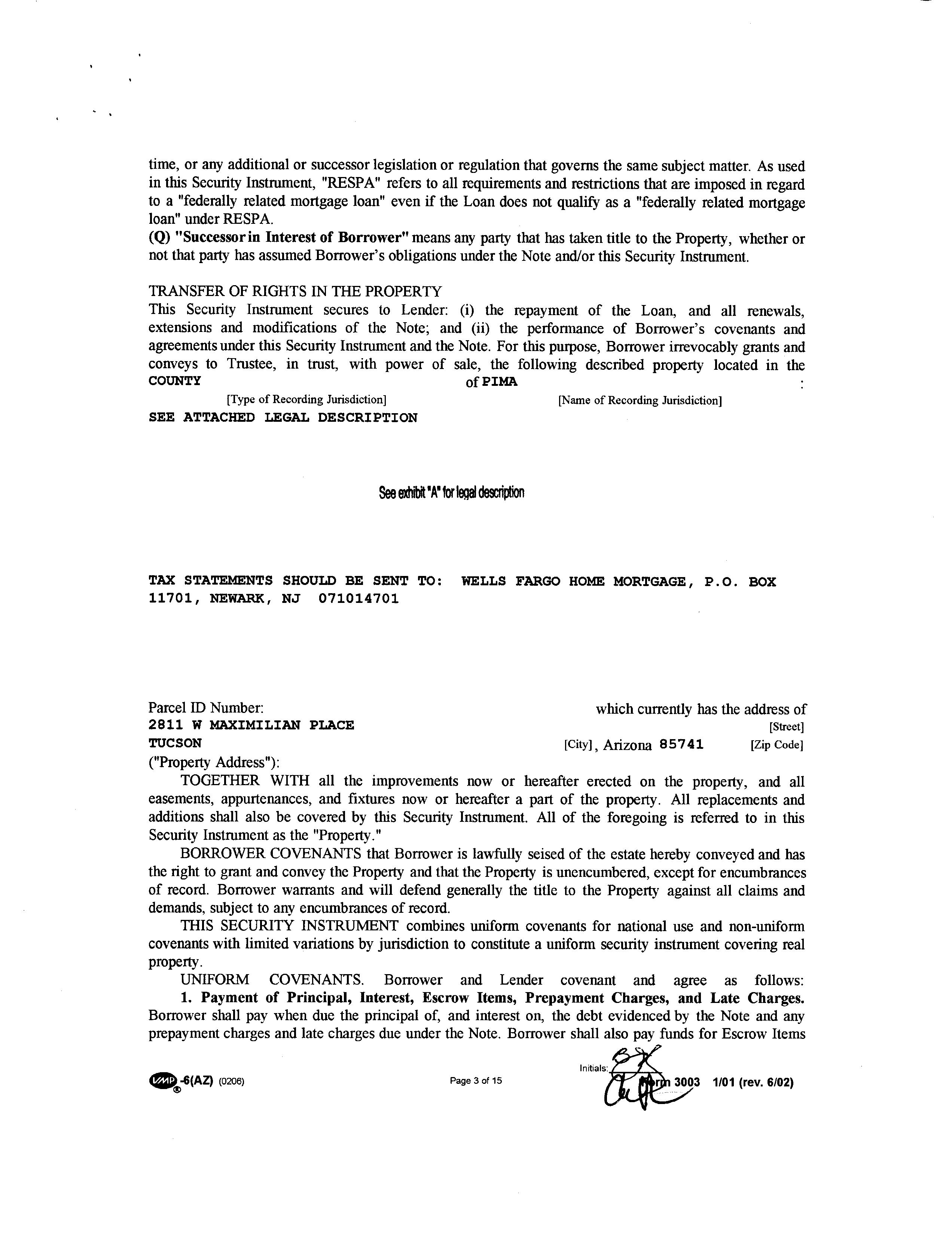 Mailing Address : 2811 W Maximilian Pl, Tucson AZ 85741-2557 C017