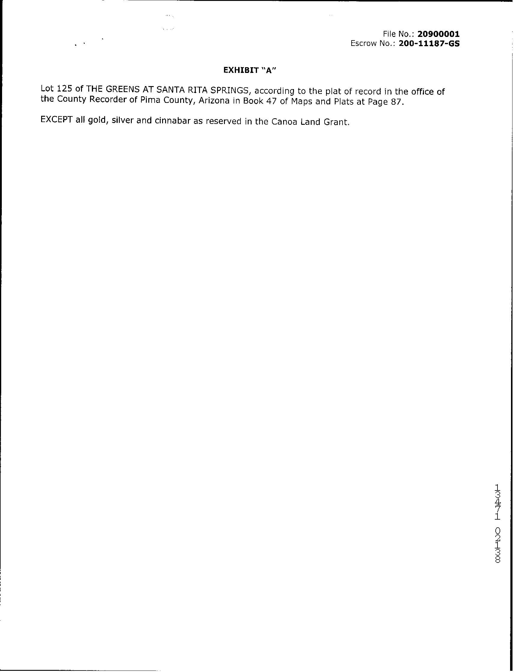 LegalDescriptionDetails LotNumber:125District:GREENVALLEYCity,Municipality,Township:SANTARITASPRINGSSubdivisionName:GREENSATSANTARITASPRINGS (THE)Sec/Twn/Rng/Mer:SEC34TWN18SRNG13EBriefDescription:GREENSATSANTARITASPRINGS(THE)LOT0125Recorder'sMapRef:PLAT:87