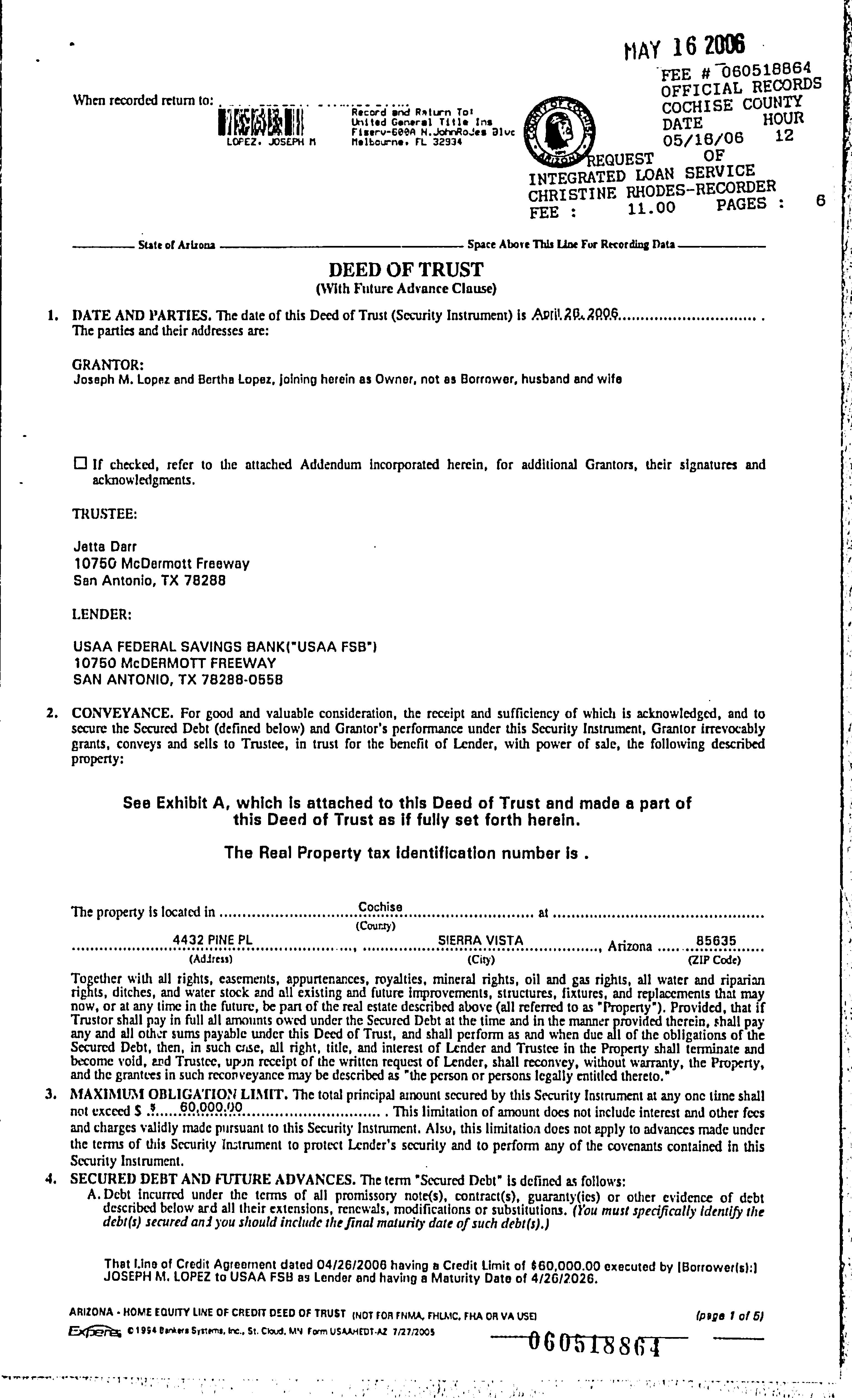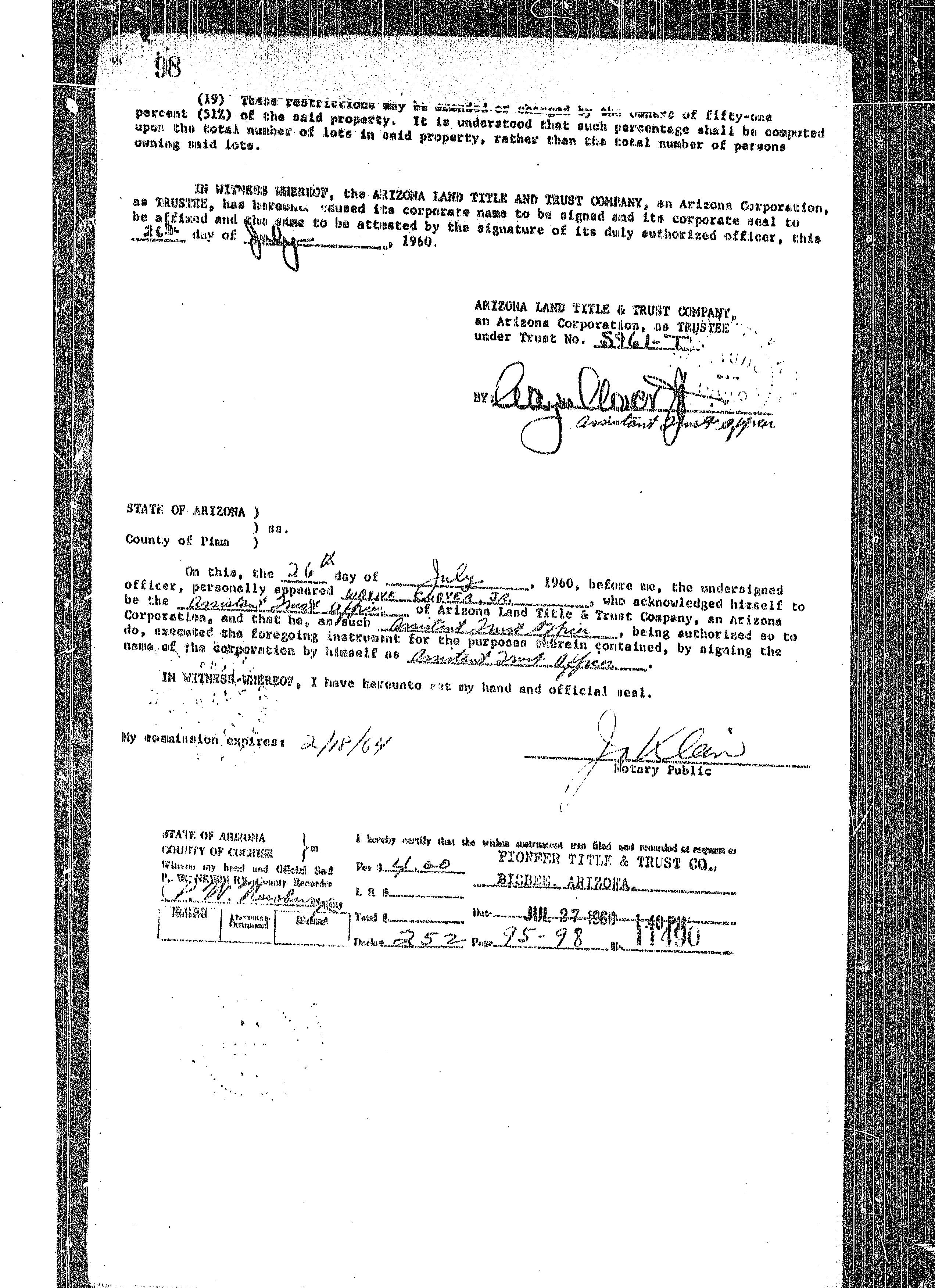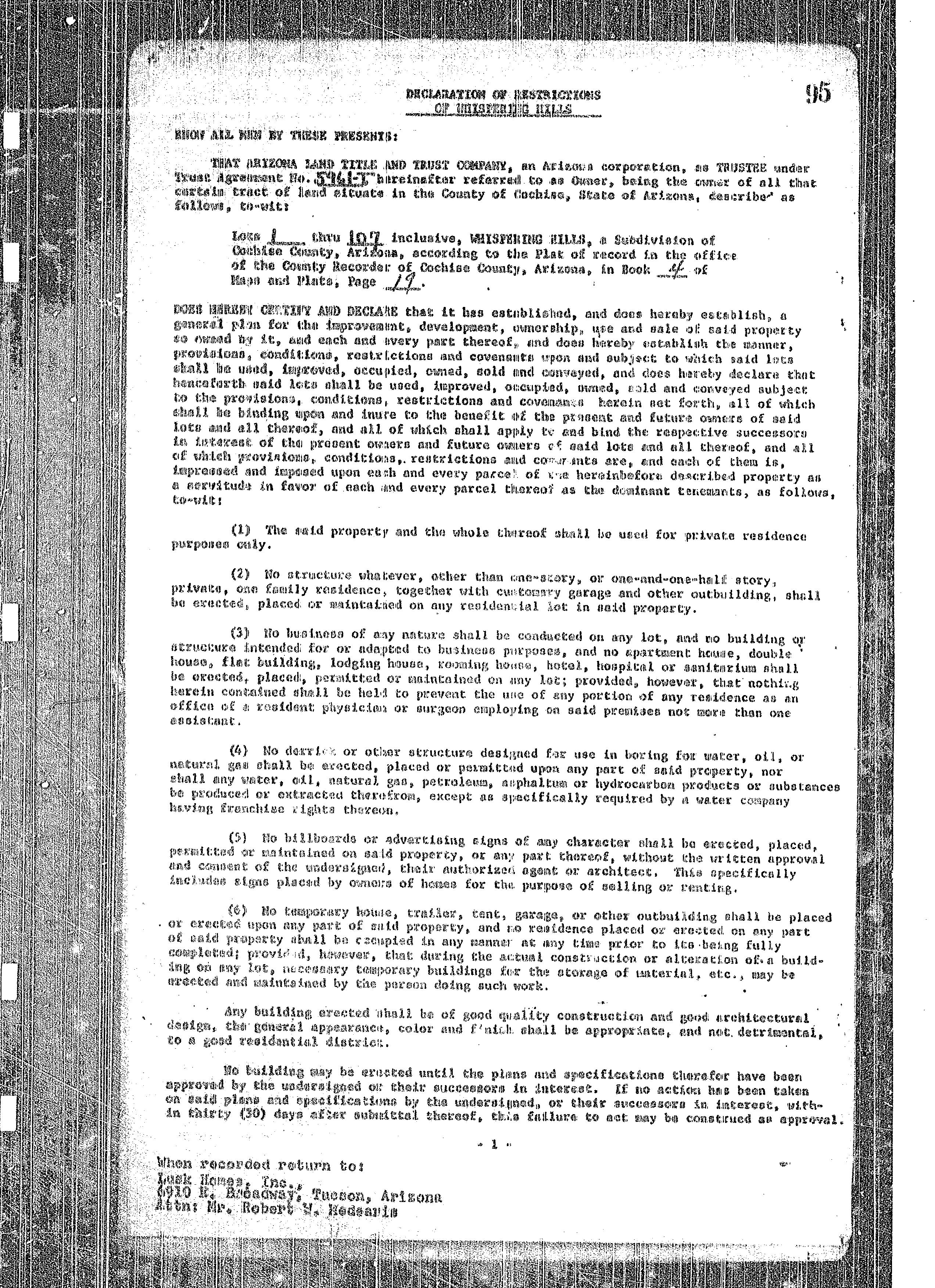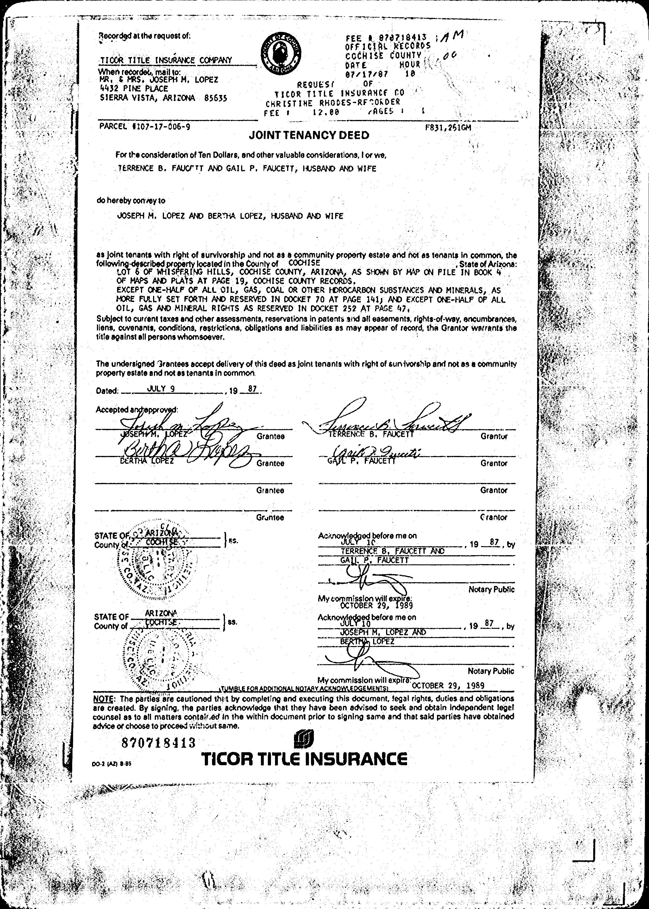 as Joint tenants with right of survivorship and not as a a communityproperty estate and not as tenants in common, the following-described property located in the County of COCHISE .State of Arizona: LOT 6 OF WHISPERING HILLS, COCHISE COUNTY, ARIZONA, AS SHOWN BY MAP ON PILE IN BOOK 4 OF MAPS AND PLATS AT PAGE 19, COCHISE COUNTY RECORDS. EXCEPT ONE-HALF OF ALL OIL, GAS, COAL OR OTHER HDROCARBON SUBSTANCES AND MINERALS, AS MORE FULLY SET FORTH AND RESERVED IN DOCKET 70 AT PAGE 141, AND EXCEPT ONE-HALF OP ALL OIL, GAS AND MINERAL RIGHTS AS RESERVED IN DOCKET 252 AT PASE 47.