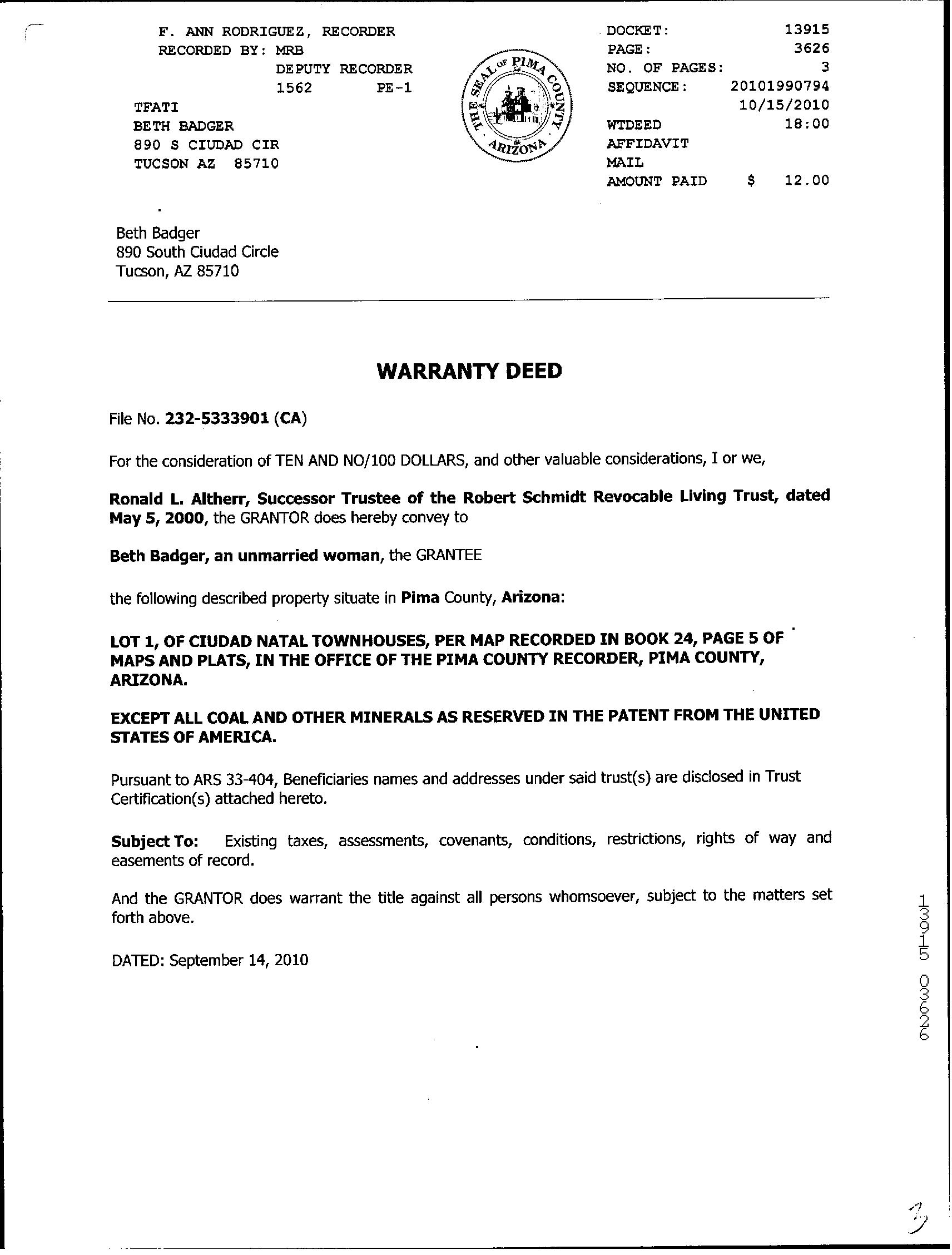 OWNER: BADGER BETH 13915 3626 10/15/2010