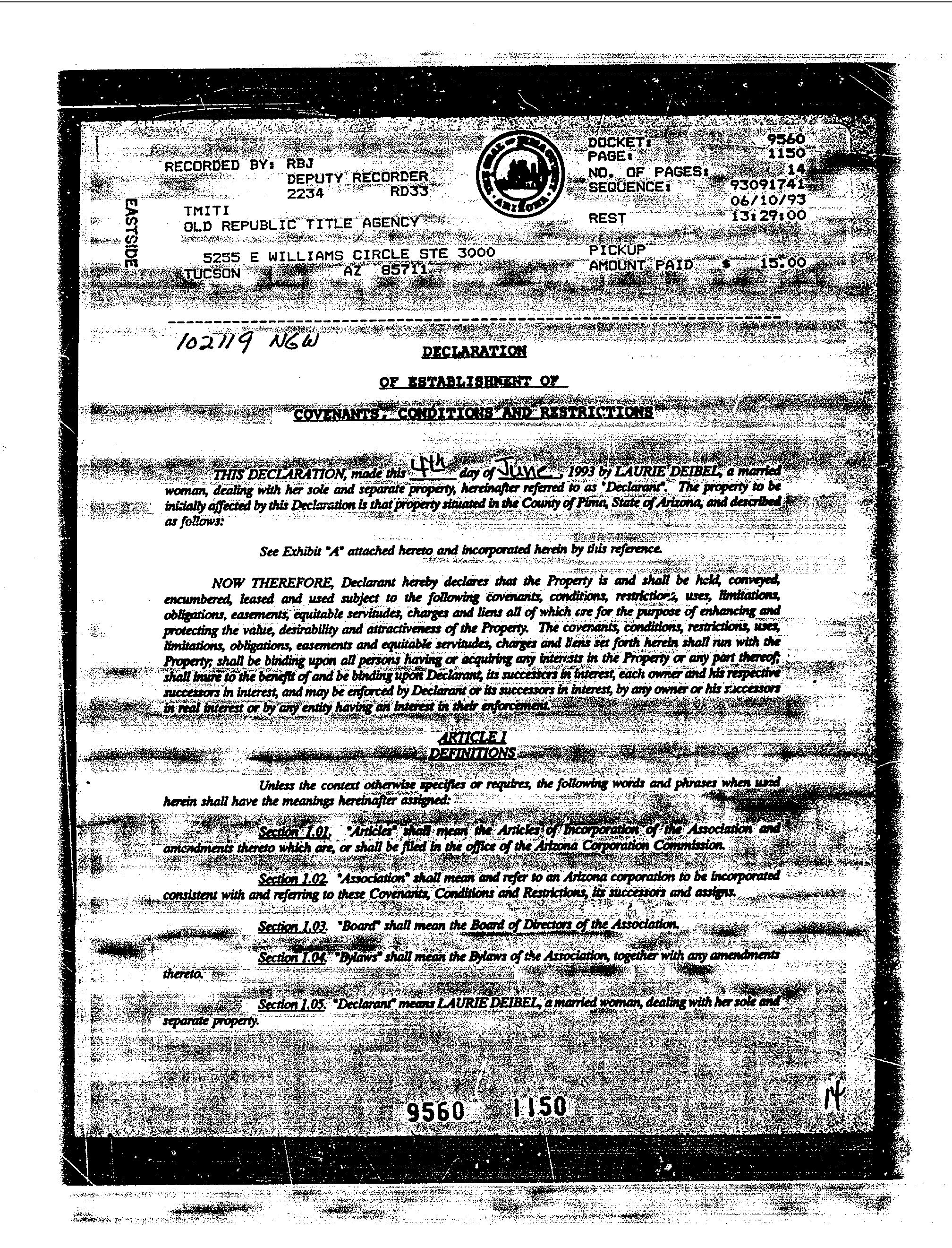 THIS DECLARATION, made thlsdayofJun 1993 by LAURIE DEIBEL maried woman, dealing with her sole and separate propery, hereinafter referred to as Declarant. The property to be inicially affected by this Declaration is that property situated in the County of Pima, State of Arizona, and described as follows: