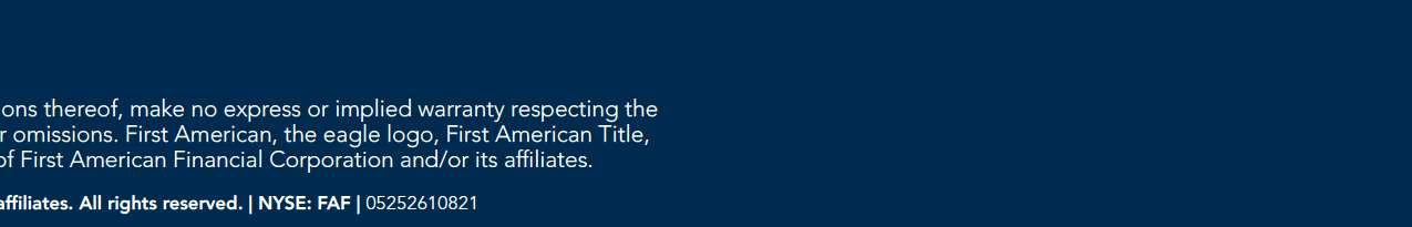 This report is not an insured product or service or a representation of the condition of title to real property. It is not an abstract, legal opinion, opinion of title, title insurance commitment or preliminary report, or any form of Title Insurance or Guaranty. This report is issued exclusively for the benefit of the Applicant therefor and may not be used or relied upon by any other person. This report may not be reproduced in any manner without First Americans prior written consent. First American does not represent or warrant that the information herein is complete or free from error, and the information herein is provided without any warranties of any kind, as-is, and with all faults. As a material part of the consideration given in exchange for the issuance of this report, recipient agrees that First Americans sole liability for any loss or damage caused by an error or omission due to inaccurate information or negligence in preparing this report shall be limited to the fee charged for the report. Recipient accepts this report with this limitation and agrees that First American would not have issued this report but for the limitation of liability described above. First American makes no representation or warranty as to the legality or propriety of recipient's use of the information herein.