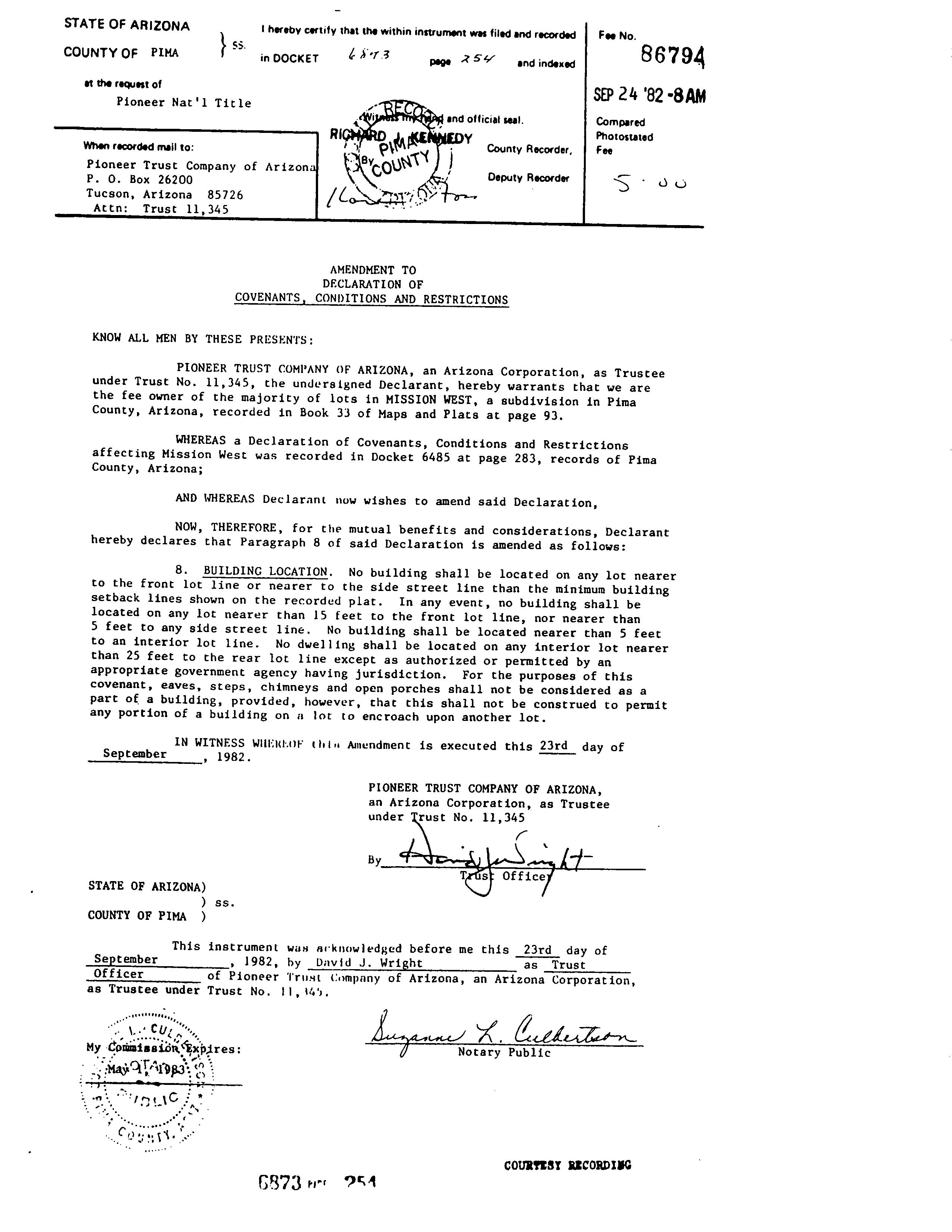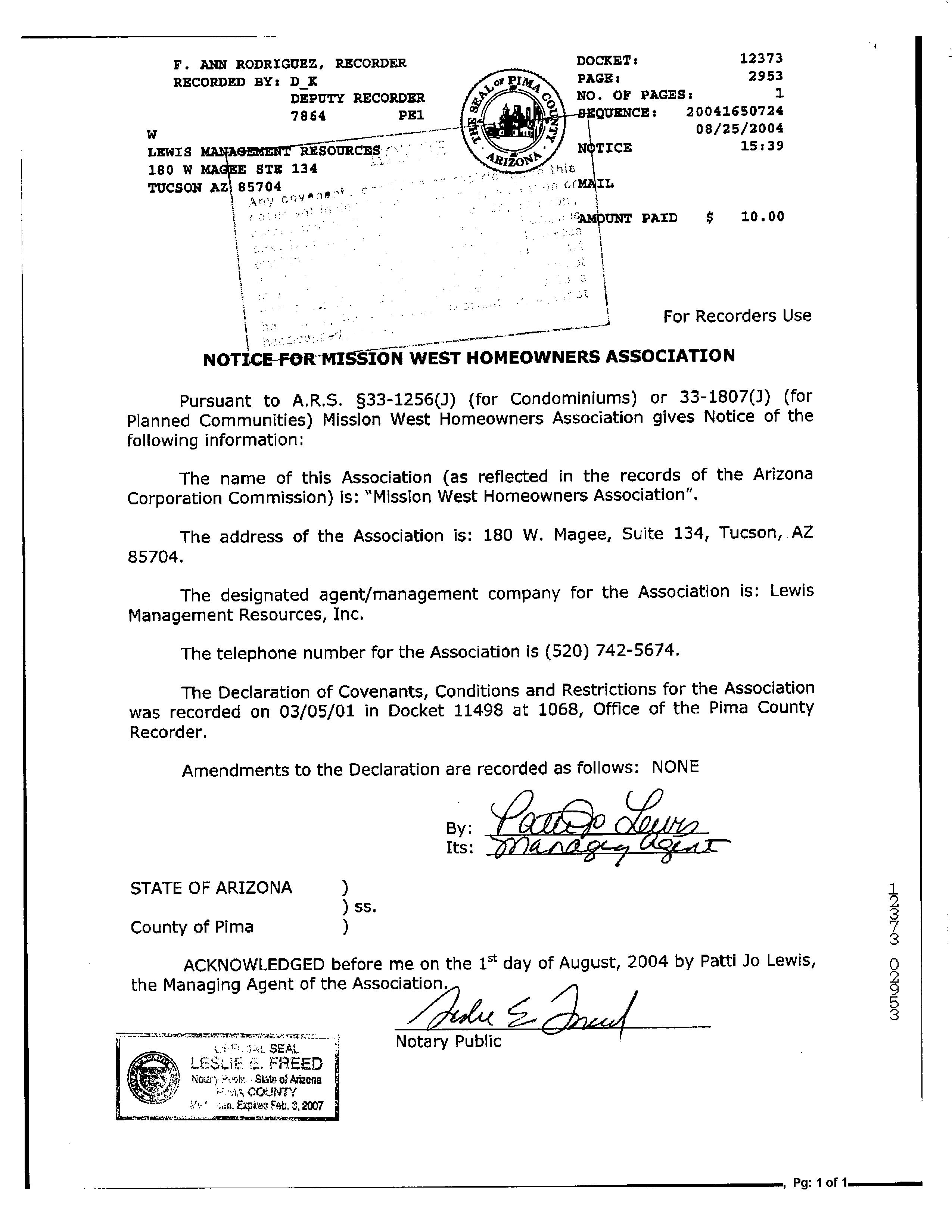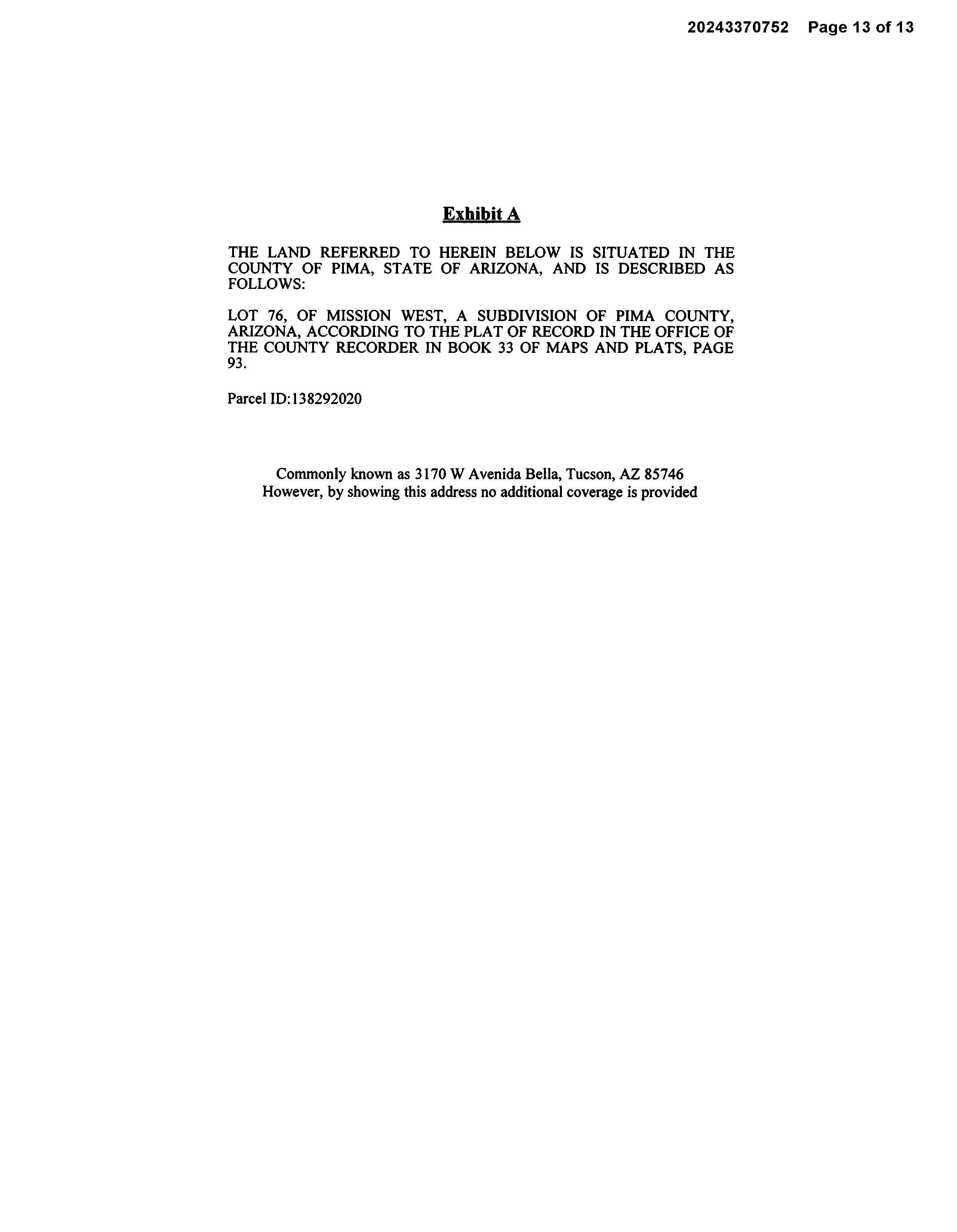Mailing Address : 3170 W Avenida Bella, Tucson AZ 85746-8301 C004