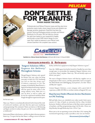 facility and the best equipment to help Tangent Solutions to grow.” Since the >4000 square foot facility located in Chandler has more than enough space to accomodate the equipment Tangent Solutions owns, it also house Shane’s airplane. Shane says, “We can literally express air deliver your parts.” The team at Tangent Solutions knows well that key suppliers are an integral part to their success, and they particularly want to recognize Star Metal Fluids and C&M Rigging, local partners, for their ‘Above and Beyond’ support. Contact Tangent Solutions, a new company with a great deal of experience, at 480-229-9901 or visit their website at TangentCNC.com