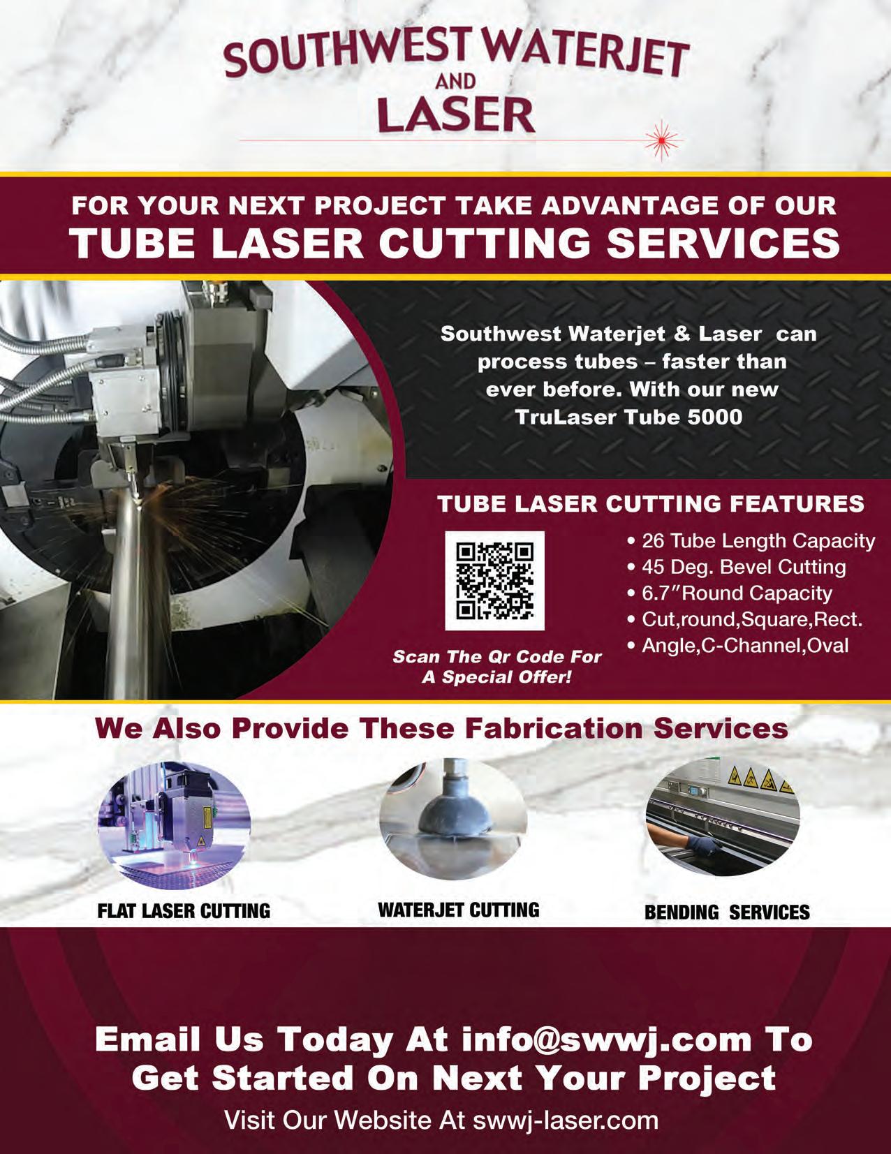 Arizona Wire & Tool 480-813-1002 Gilbert Metal Stamping 480-503-1283 Moore Tool & Die 480-622-1705 Pro-Tek_____________928-759-9494 Thompson Machine ______ 505-823-1453 Whitley Machine________602-323-5550 Wrico 480-892-7800 TOOLING EDM Tech 602-278-6666 Moore Tool & Die 480-622-1705 Paragon Machining & Design 480-635-9163 Pro-Tek_____________928-759-9494 Western Sintering _______ 509-375-3096 TUBING Assembly Formed Tubing Service & Sales ________ 480-968-9084 Formed Tubing AERO Spring & Mfg Co 602-243-4329 Tube Bending /Fabrication A1 Precision Metal & Aerospace 623-377-2191 K-zell Metals, Inc. 602-232-5882 Service & Sales 480-968-9084 Tube Laser Cutting/ Fabrication Wal-Tek Industries 623-587-4611 WATERJET CUTTING Alpha Machine 602-437-0322 AZMF Precision 602-476-7477 Creedbilt Inc __________ 623-939-8119 East Valley Precision ______ 480-288-6601 EDM Tech 602-278-6666 Flow International 800-446-3569 Jan’s Inc. 480-833-7305 A2Z MANUFACTURING SW • 92 • March / Apr 2023