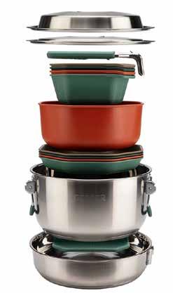 ComplEAT Cook Set (16 deler) har alt du trenger for å enkelt mette en gruppe sultne turgåere. Settets kjele og sautépanne har romslige stekeflater og en 3-lags bunn som gir jevn varmefordeling. Servisedelene gjør matlaging enklere og gir god plass til store porsjoner. Når måltidet er ferdig, pakkes alt sammen i oppbevaringsposen for sikker og kompakt lagring mellom turene.