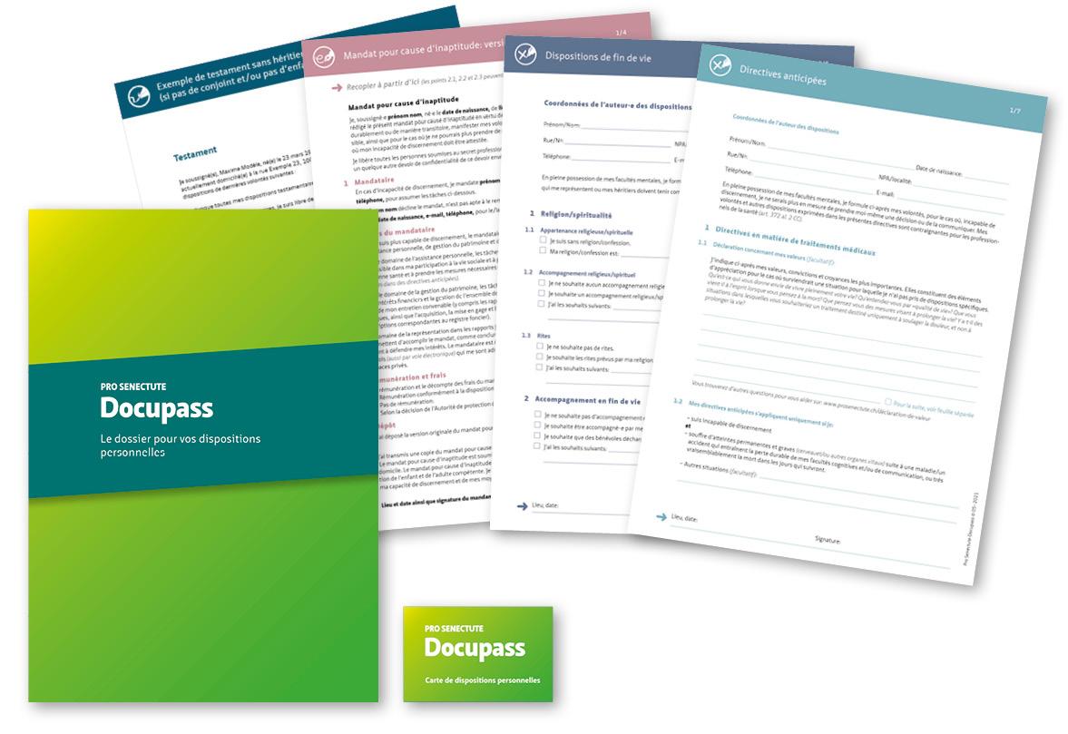 Le dossier de prévoyance Docupass de Pro Senectute est une solution globale reconnue pour tous les aspects pouvant être réglés à l’aide d’un document de prévoyance: des directives anticipées au mandat pour cause d’inaptitude (avec carte) en passant par les dispositions de fin de vie. En collaboration avec des expertes et experts des domaines de la médecine, du droit et de l’éthique ainsi que de la consultation, Pro Senectute a créé ce jeu de documents complet contenant de nombreuses informations pour la prévoyance personnelle.
