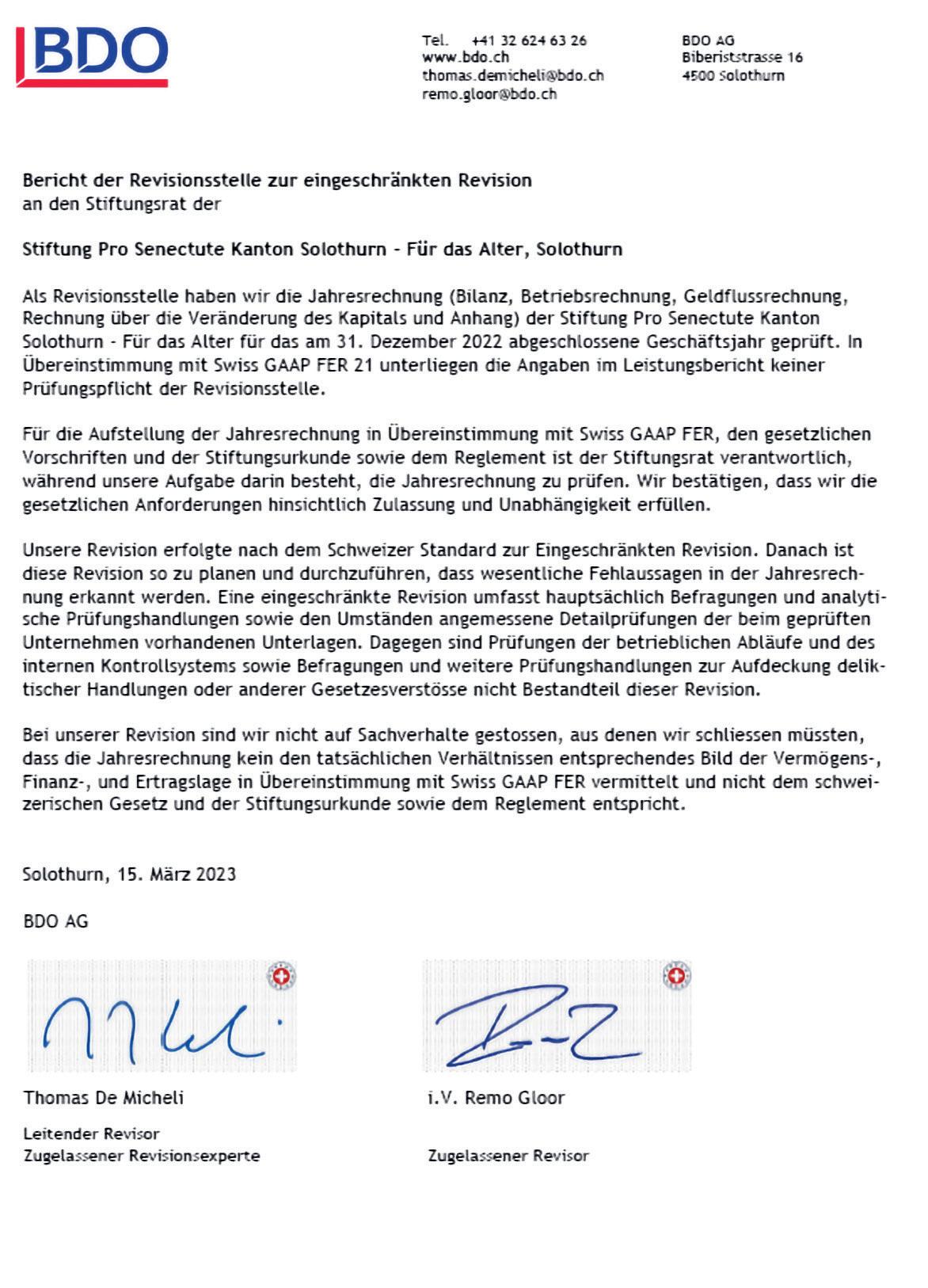 Pro Senectute Kanton Solothurn ist eine mit dem ZEWO-Gütesiegel zertifizierte Fachorganisation für Altersfragen und ein gemeinnütziges Hilfswerk. Die Rechnungslegung erfolgte nach Swiss GAAP FER 21 und die ZEWO-Methodik fand Anwendung.