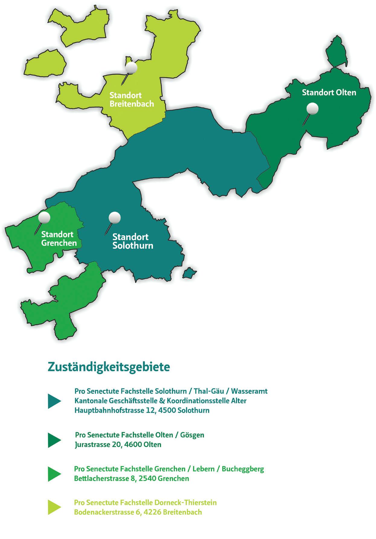 Pro Senectute ist im Kanton Solothurn mit vier Kontakt-, Informations-, Anlauf- und Fachstellen für Altersfragen vertreten. Mit den Dienstleistungen werden alle Einwohnergemeinden des Kantons Solothurn abgedeckt.