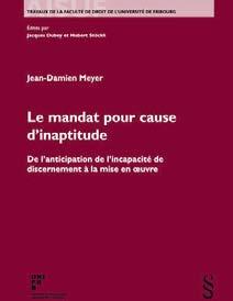 Jean-Damien Meyer. Zurich : Schulthess, 2021. Face aux nouveaux défis posés par le vieillissement démographique de la population suisse et l’augmentation du nombre de personnes atteintes de démence ces prochaines années, le mandat pour cause d’inaptitude (art. 360-369 CC) doit devenir un instrument suffisamment fiable, sécurisé et efficient. Pour parvenir à ce résultat, l’auteur s’aide de l’expérience québécoise afin de souligner les lacunes du droit suisse et de proposer une nouvelle approche de cette institution juridique. La présente thèse de doctorat s’adresse aussi bien aux personnes soucieuses d’organiser leur protection en cas d’incapacité de discernement, qu’aux mandataires et aux praticiens du droit de la protection de l’adulte.