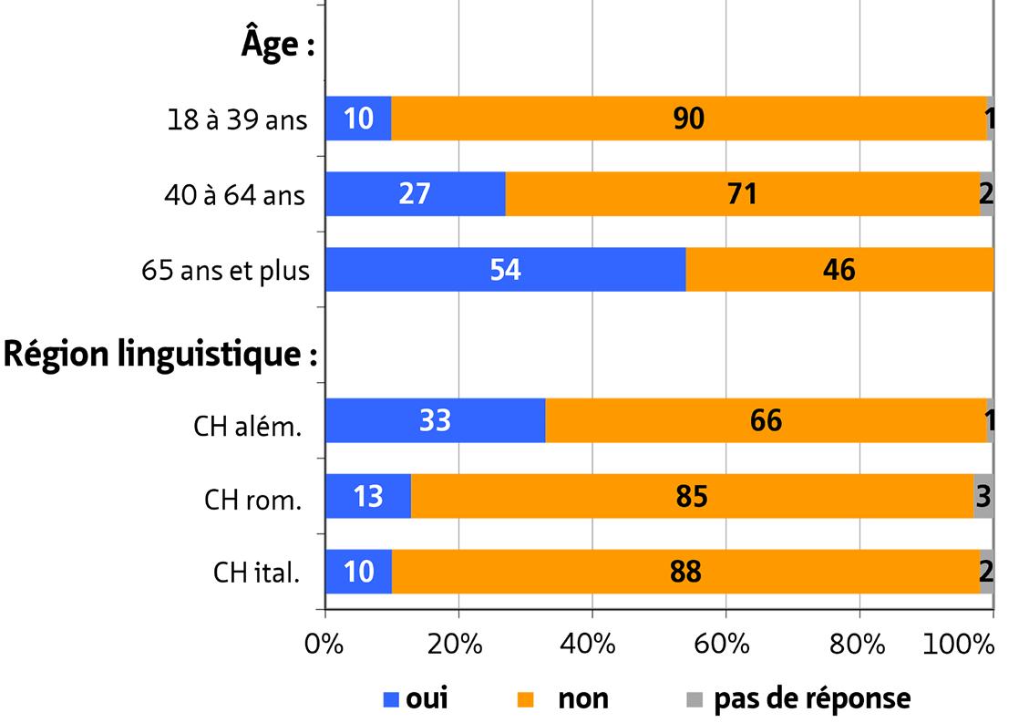 L’enquête vise à établir combien de personnes ont effectivement rempli un mandat pour cause d’inaptitude. Durant les deux dernières années, le pourcentage de documents remplis était en léger recul pour toutes les tranches d’âge. Depuis le premier sondage en 2017, le taux de mandats remplis a toutefois connu une hausse significative chez les personnes de plus de 65 ans. Ainsi, une personne sur deux de cette tranche d’âge qui en a connaissance est en possession d’un document rempli. En comparaison, seules trois personnes sur dix au sein de la population suisse disposent d’un tel document. La probabilité de remplir cette formalité augmente donc sensiblement avec l’âge.