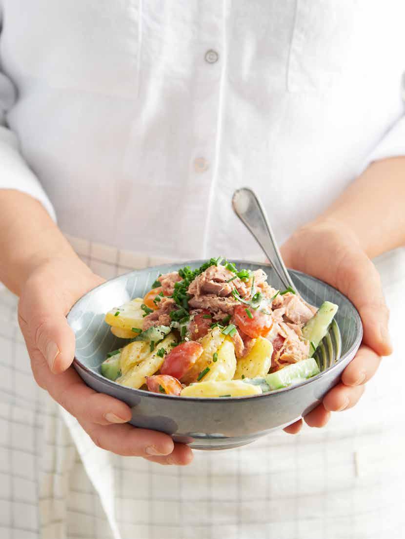 Mélanger moutarde, vinaigre, huile et yogourt. Tailler le concombre en bâtonnets, couper les tomates en deux, ajouter le tout aux pommes de terre, mélanger délicatement, rectifier l’assaisonnement, dresser. Égoutter le thon, répartir dessus, ciseler la ciboulette, parsemer.
