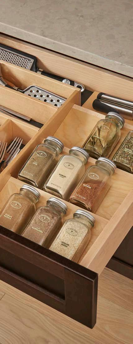 Maximize your kitchen space by utilizing areas you may not have even thought about—five inches is all it takes to tuck a full spice rack behind a furniture leg! Custom fit drawer organizers and pull-out counter storage make the most of every nook and cranny, and a secret drawer for trays and pans makes the most of toe kick space. Even a heavy stand mixer is easy to access on its own specialized lifting shelf.