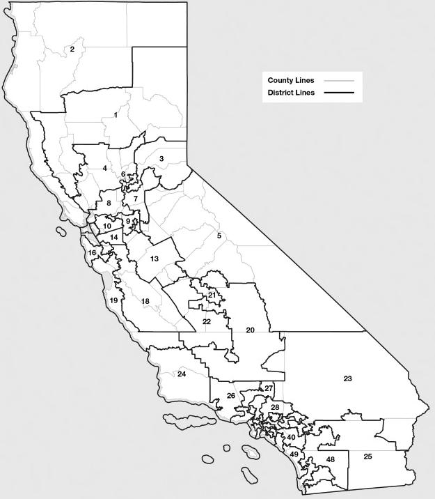 osition 50 are targeting five Republican-held seats in Congress, as well as aiming to decrease competition in swing districts. The odds of Republicans being elected in each district will be lowered by the new map, because districts with a majority of right-leaning voters will be broken up. Parts of these former districts will be incorporated into far left-leaning districts on the new map, where Republican votes