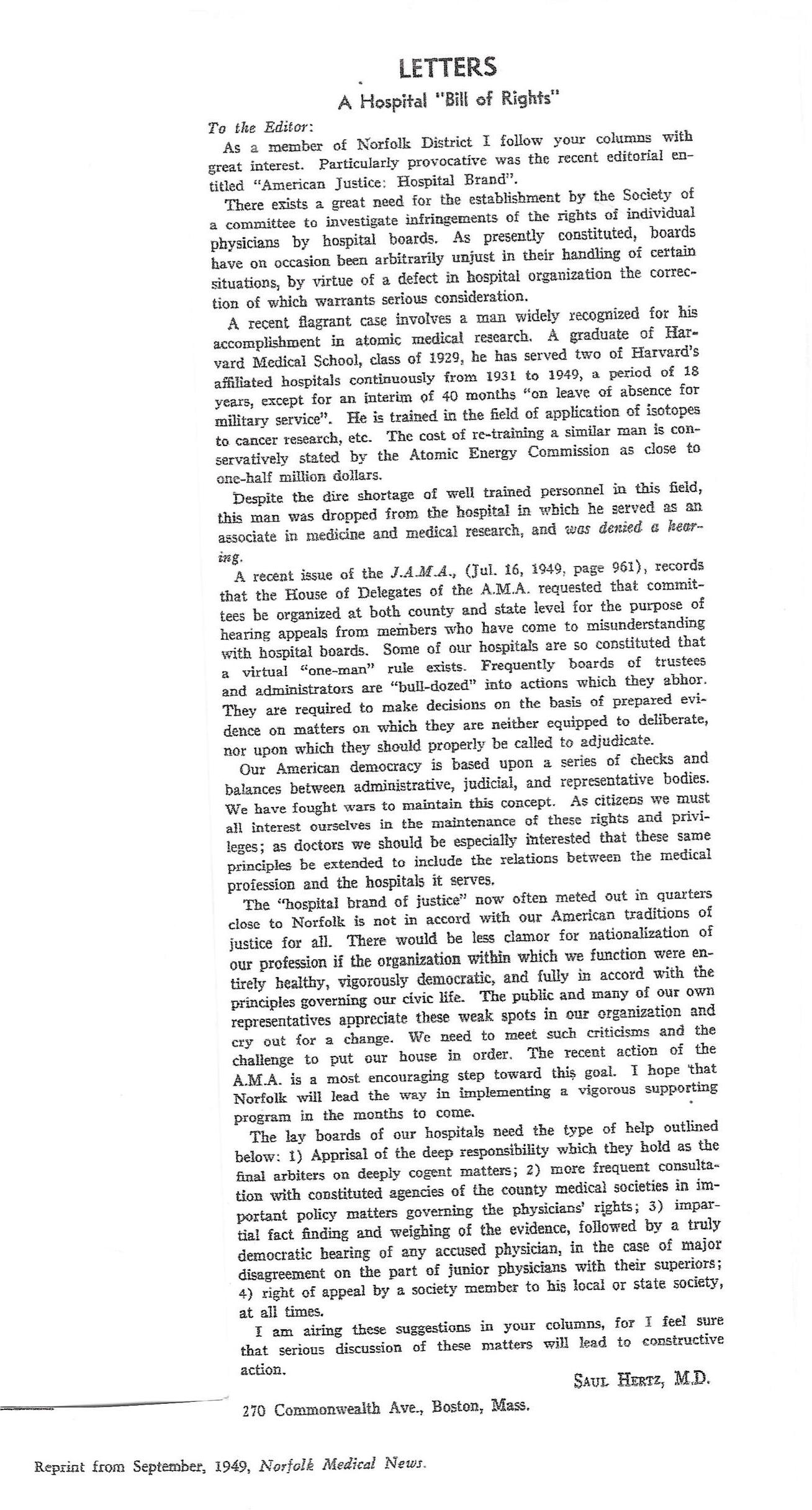 Letter from Saul Hertz to Norfolk Medical News; A Hospital "Bill of Rights" September 1949