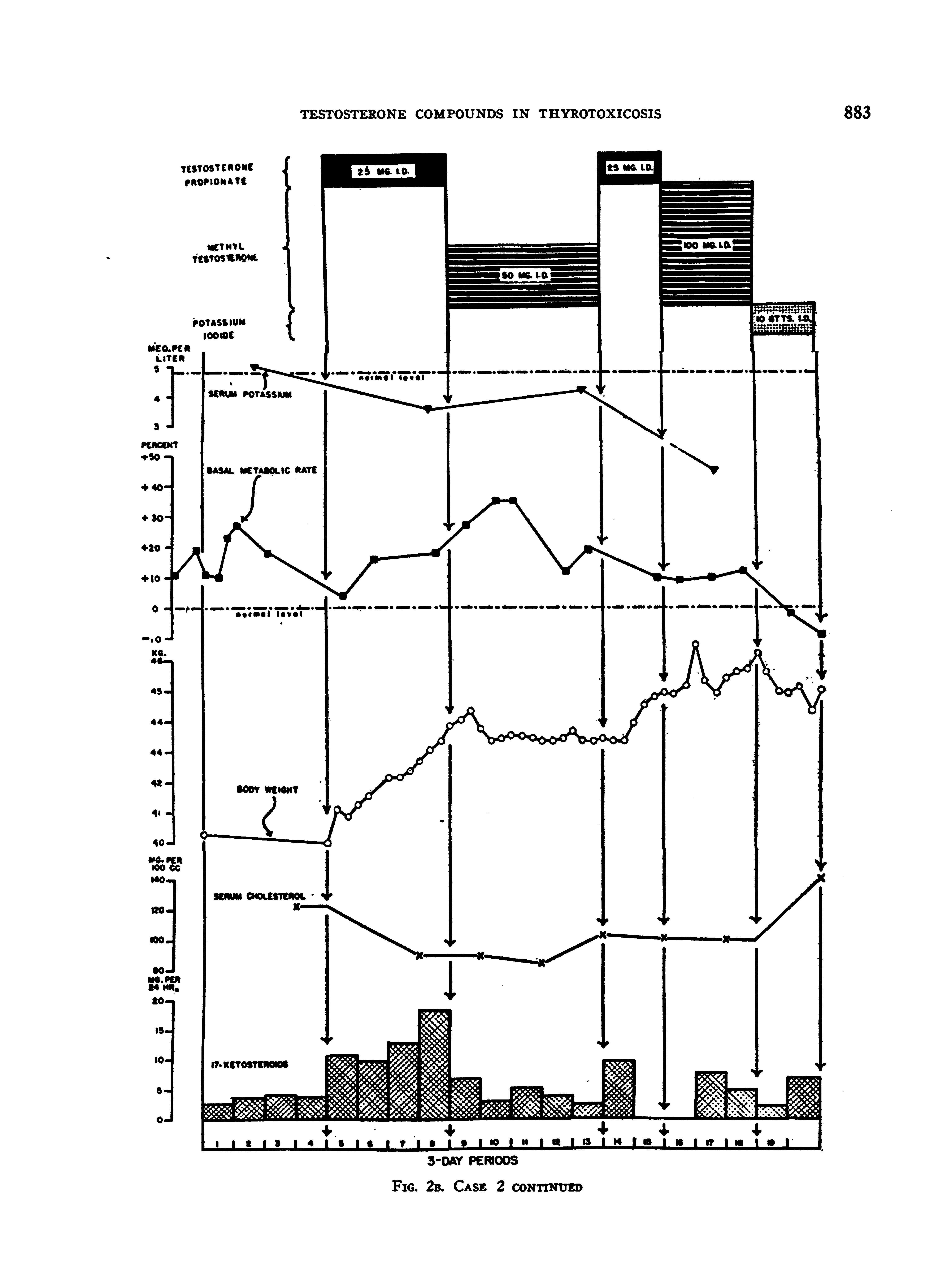 He was placed, accordingly, on the following program: (1) 4 periods of no treatment (except potassium iodide); (2) 4 periods of 12.5 mgm. of testosterone propionate daily; (3) 4 periods of 100 mgm. of methyl testosterone daily; (4) 4 periods of 25 mgm. of testosterone propionate daily; (5) 4 periods of 50 mgm. of testosterone propionate daily; (6) 6 periods of 100 mgm. of testosterone propionate daily; and (7) 4 periods of no treatment (except potassium iodide).
