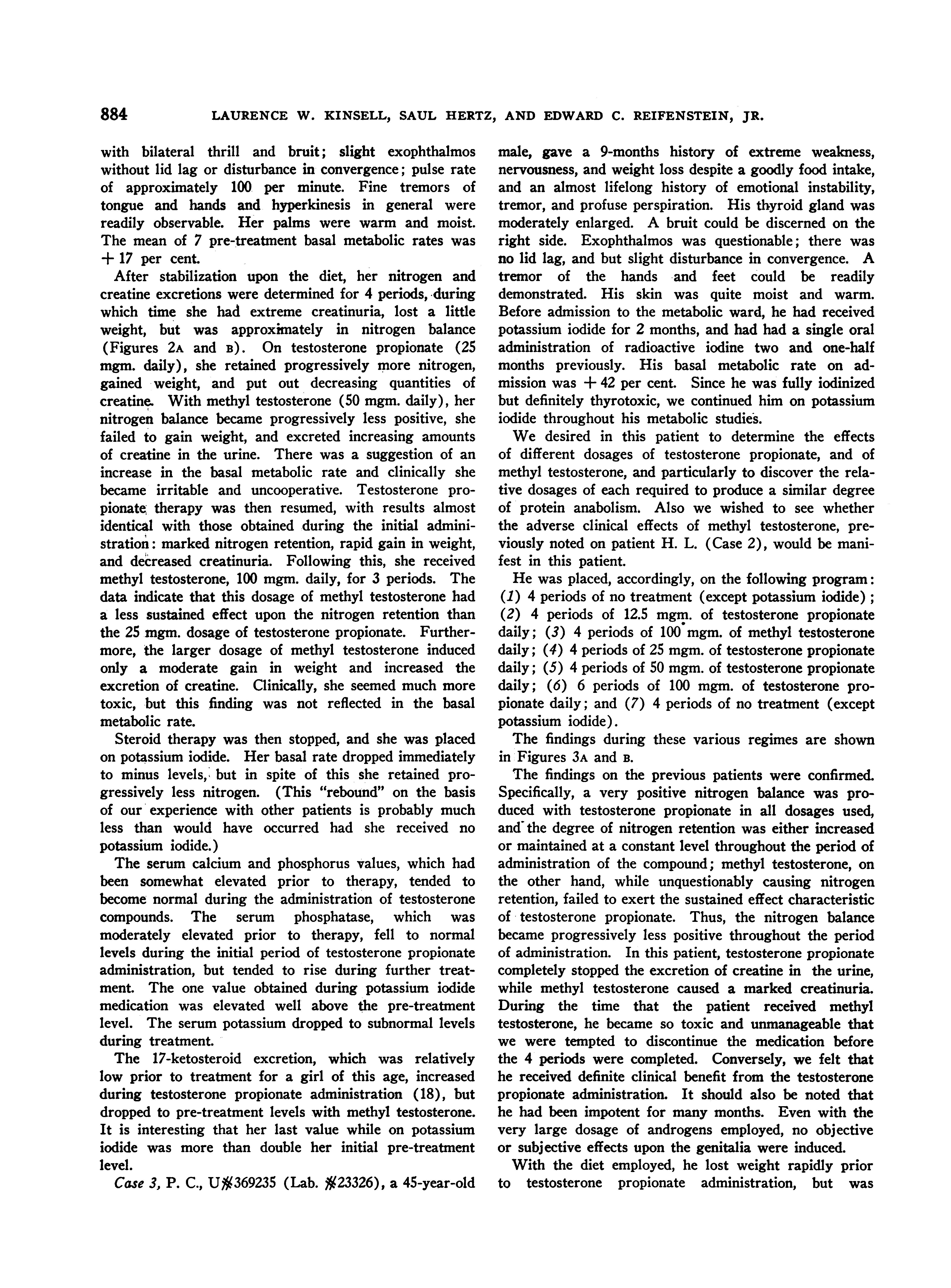 We desired in this patient to determine the effects of different dosages of testosterone propionate, and of methyl testosterone, and particularly to discover the relative dosages of each required to produce a similar degree of protein anabolism. Also we wished to see whether the adverse clinical effects of methyl testosterone, previously noted on patient H. L. (Case 2), would be manifest in this patient.