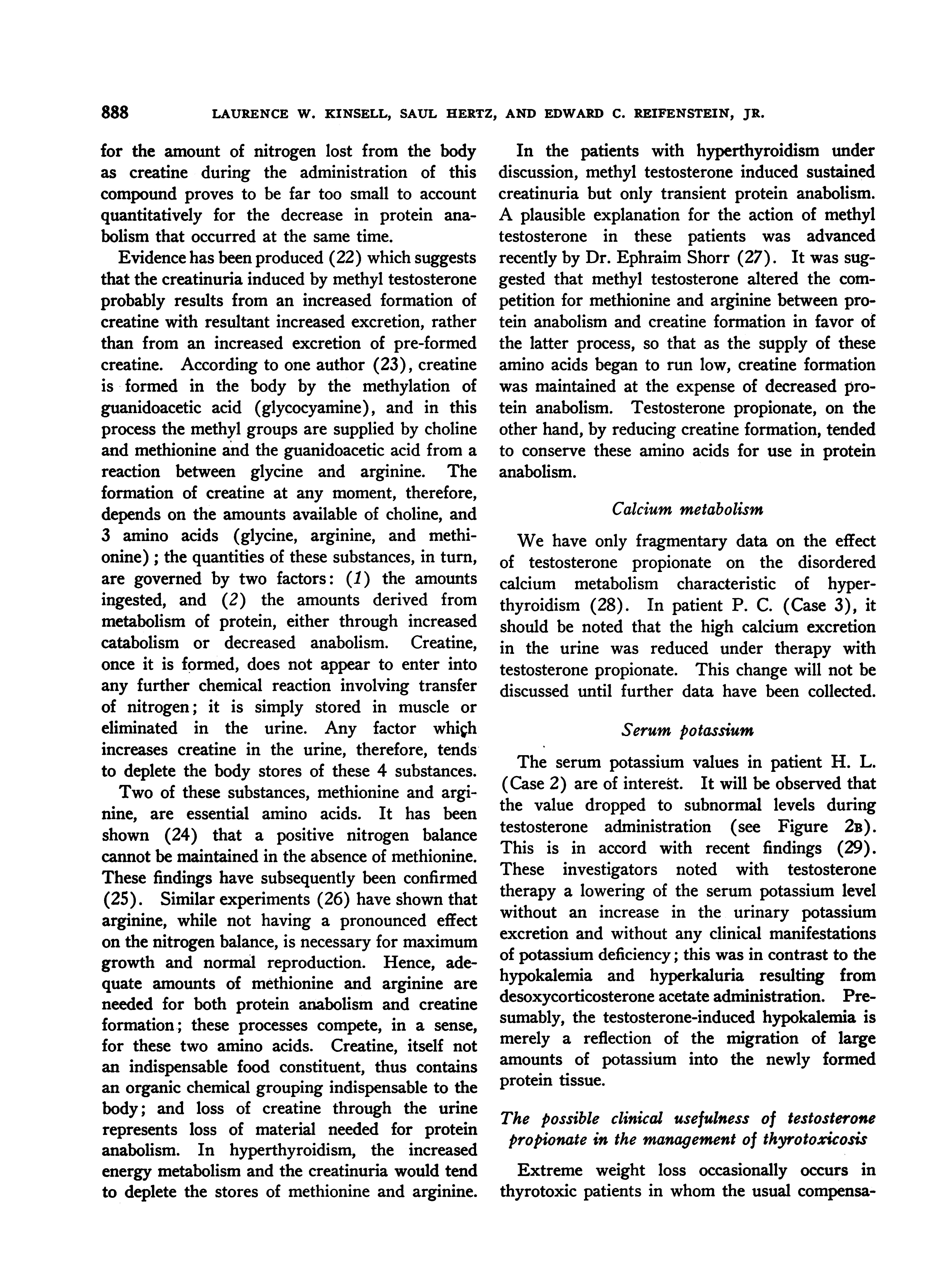 In the patients with hyperthyroidism under discussion, methyl testosterone induced sustained creatinuria but only transient protein anabolism. A plausible explanation for the action of methyl testosterone in these patients was advanced recently by Dr. Ephraim Shorr (27). It was suggested that methyl testosterone altered the competition for methionine and arginine between protein anabolism and creatine formation in favor of the latter process, so that as the supply of these amino acids began to run low, creatine formation was maintained at the expense of decreased protein anabolism. Testosterone propionate, on the other hand, by reducing creatine formation, tended to conserve these amino acids for use in protein anabolism.