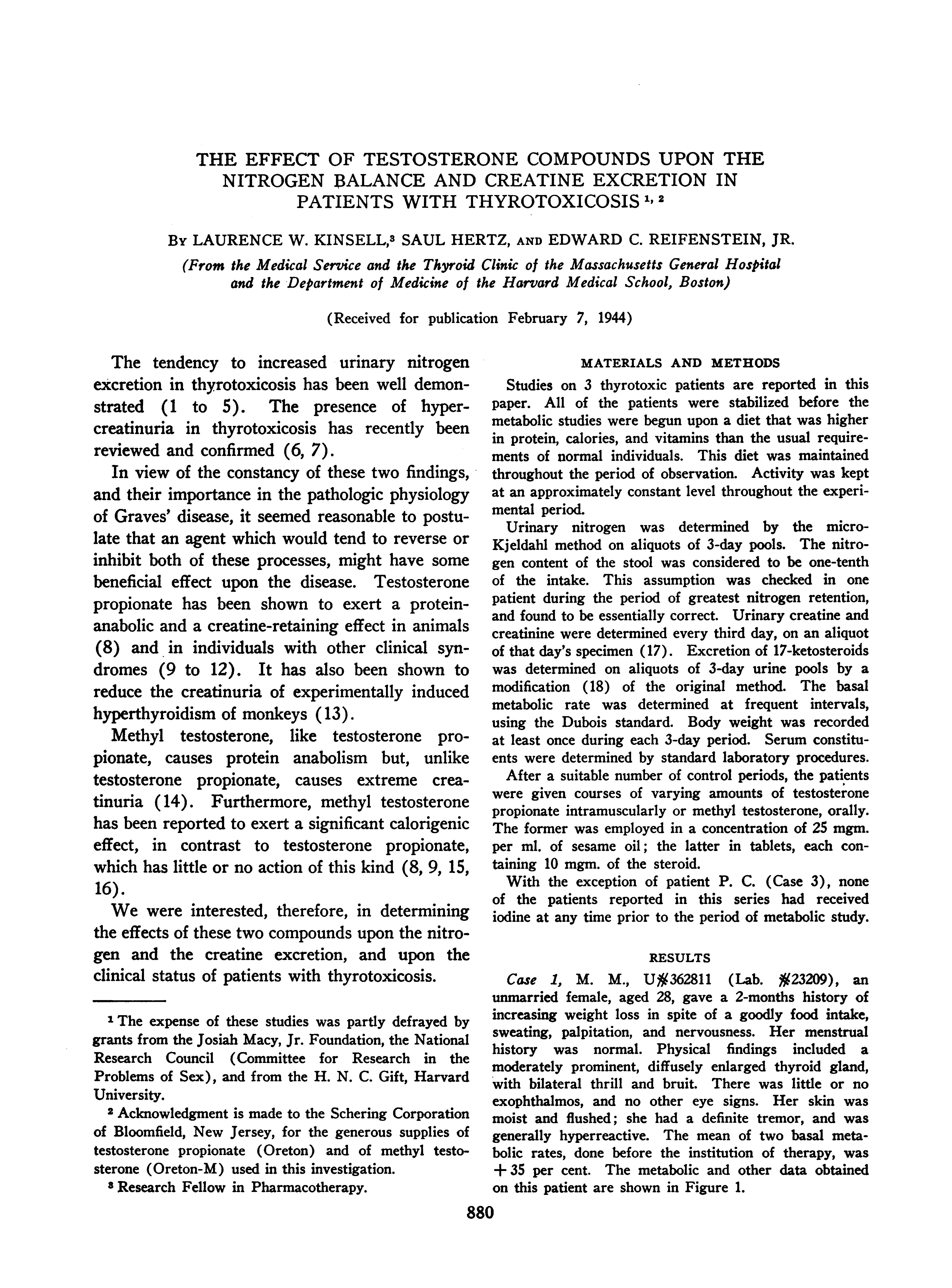13. Jailer, J. W., The effect of testosterone propionate on creatinuria of experimental hyperthyroidism in male and female monkeys. Endocrinology, 1941, 29, 89.