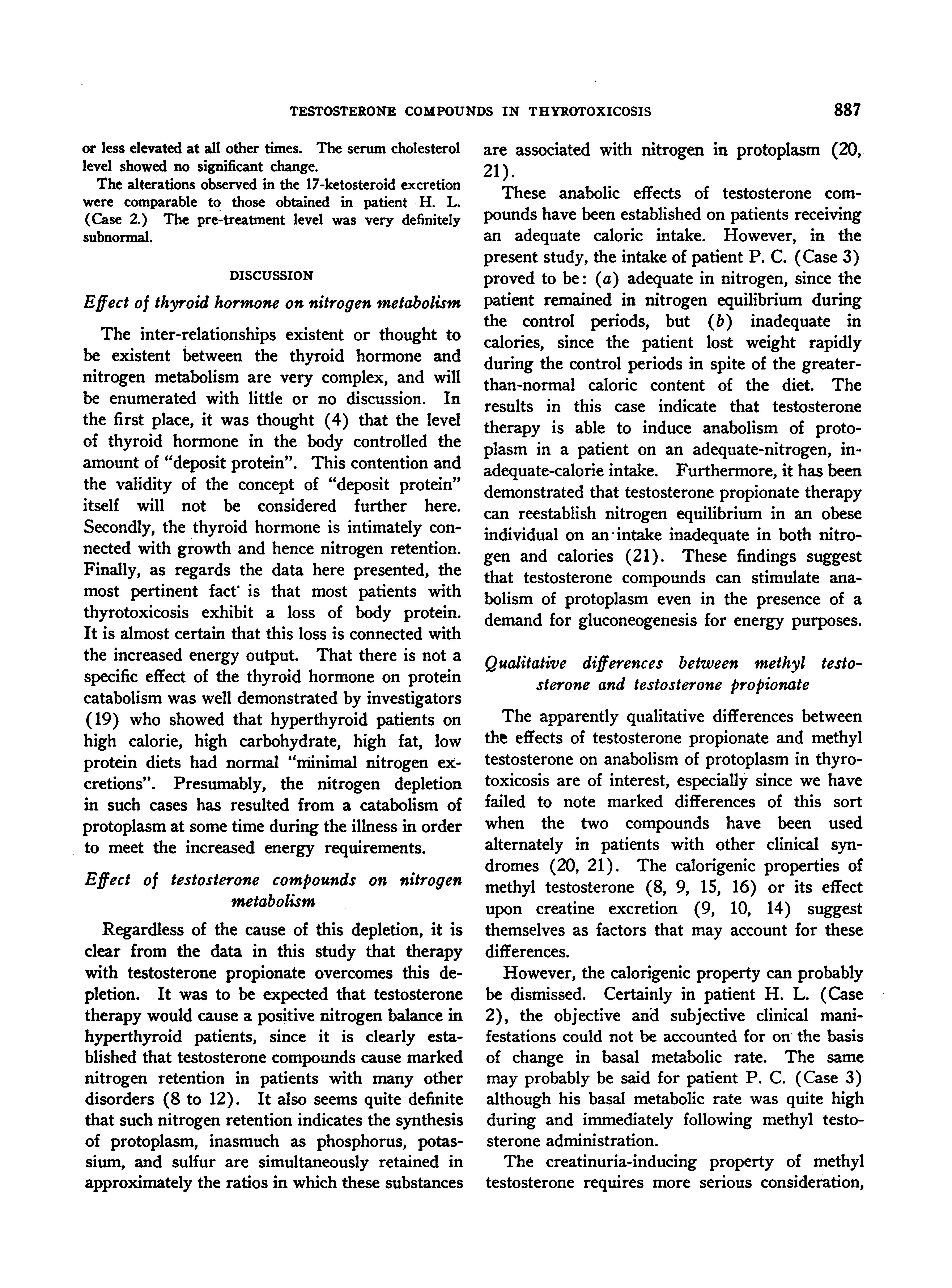 The apparently qualitative differences between the effects of testosterone propionate and methyl testosterone on anabolism of protoplasm in thyrotoxicosis are of interest, especially since we have failed to note marked differences of this sort when the two compounds have been used alternately in patients with other clinical syndromes (20, 21). The calorigenic properties of methyl testosterone (8, 9, 15, 16) or its effect upon creatine excretion (9, 10, 14) suggest themselves as factors that may account for these differences.