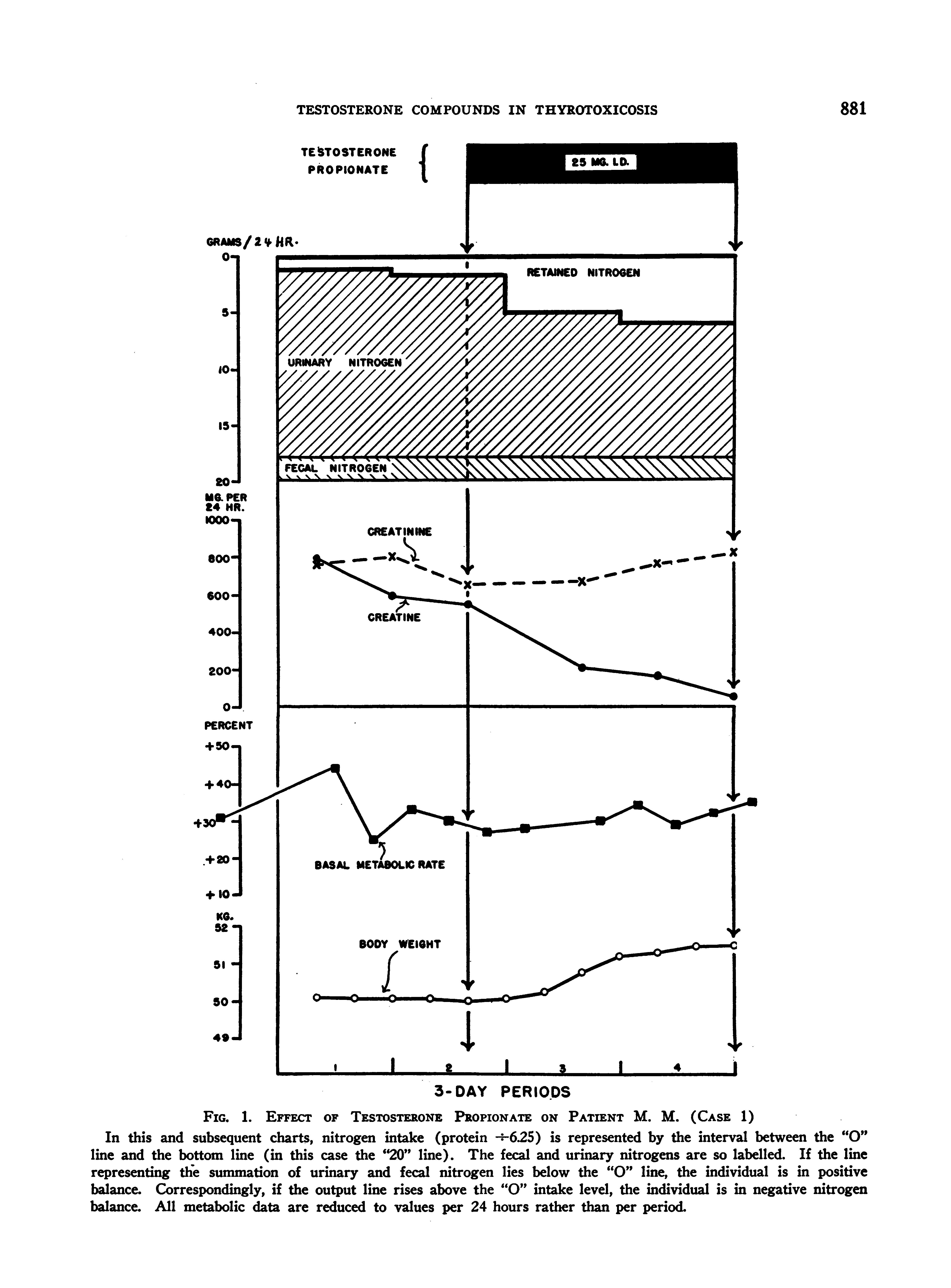 In spite of the brief control period in this patient, the increase in nitrogen retention, the gain in weight, and the decrease in creatinuria, induced by testosterone propionate therapy, are quite apparent. Her basal metabolic rate did not change significantly.