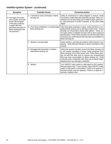 Intellifire Ignition System - (continued) Symptom 4. Pilot lights but continues to spark, and main burner will not ignite. (If the pilot continues to spark after the pilot flame has been lit, flame rectification has not occurred.)