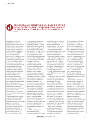profissionais para a elaboração de projetos de segurança contra incêndio e medidas de autoproteção, estabelecendo que, até ao prazo máximo de 180 dias após a entrada em vigor da Proposta de Lei, os profissionais associados das respetivas ordens profissionais abrangidos pelo Artigo 15.º-A, que àquela data não reúnam os requisitos exigidos para a elaboração de projetos de segurança contra incêndio em edifícios relativos a edifícios e recintos, ou de medidas de autoproteção, possam continuar a assumir a responsabilidade pela sua conceção, desde que, com a entrega dos projetos de SCIE ou das medidas de autoproteção, comprovem que são associados das respetivas Ordens Profissionais. Resultante da publicação do Acórdão, desde 15 de julho, os projetos de especialidade de segurança contra incêndio, nos termos da Lei n.º 31/2009 de 3 de julho, na sua versão atual, deverão ser elaborados e subscritos por arquitetos, arquitetos paisagistas, engenheiros e engenheiros técnicos, com inscrição válida em associação profissional. Conclui-se, referindo que a declaração de inconstitucionalidade não tem por efeito a afetação da validade dos projetos de SCIE e medidas de autoproteção já elaborados, nem das condições materiais e técnicas e do regime de controlo e fiscalização a observar nos termos do diploma em matéria de SCIE. V 11.