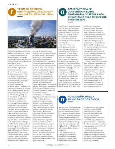 eletrónica, a consultoria especializada em Soluções de Segurança e o panorama atual e tendências futuras da videovigilância e, através destas, os participantes do evento puderam obter informações acerca das alterações que se perspetivam no âmbito do atual Regime Jurídico de Segurança Privada, das vantagens associadas à contratação de serviços especializados de consultoria de segurança e ainda das novas valências e possibilidades proporcionadas pelas câmaras e sistemas de videovigilância. O evento, tendo sido organizado pela Ordem dos Engenheiros em conjunto com o CONFEA, focou, acima de tudo, a forma como a Engenharia de Segurança, nas suas várias vertentes, é tratada em Portugal e no Brasil. Estas duas visões mereceram um destaque especial nos painéis dedicados à qualificação da Engenharia de Segurança, à segurança contra incêndio e segurança no trabalho. V